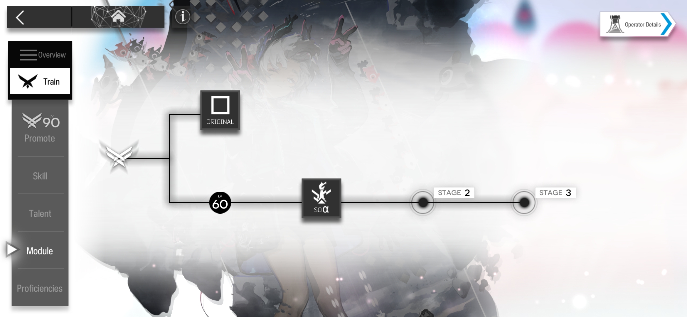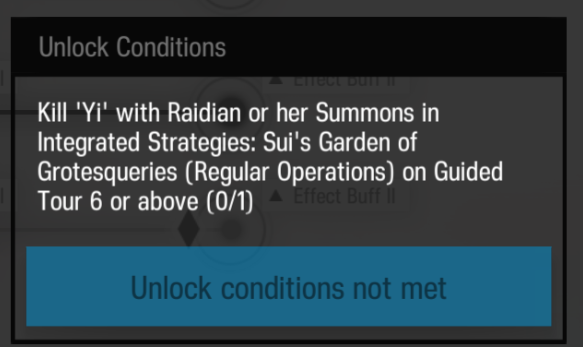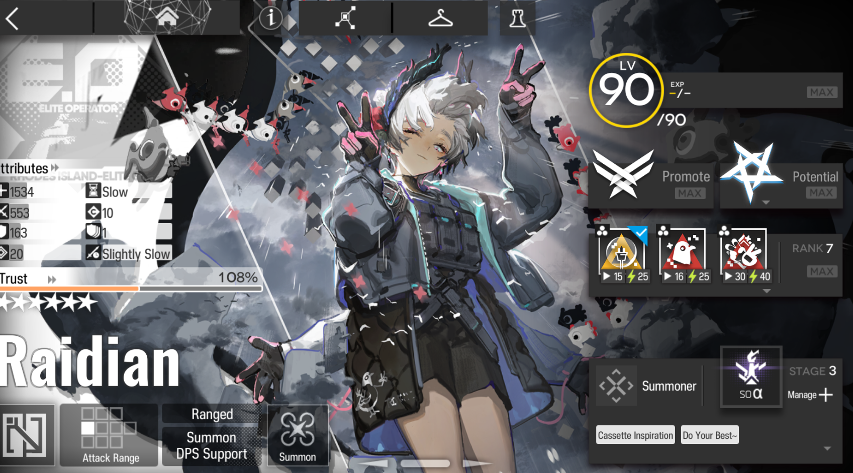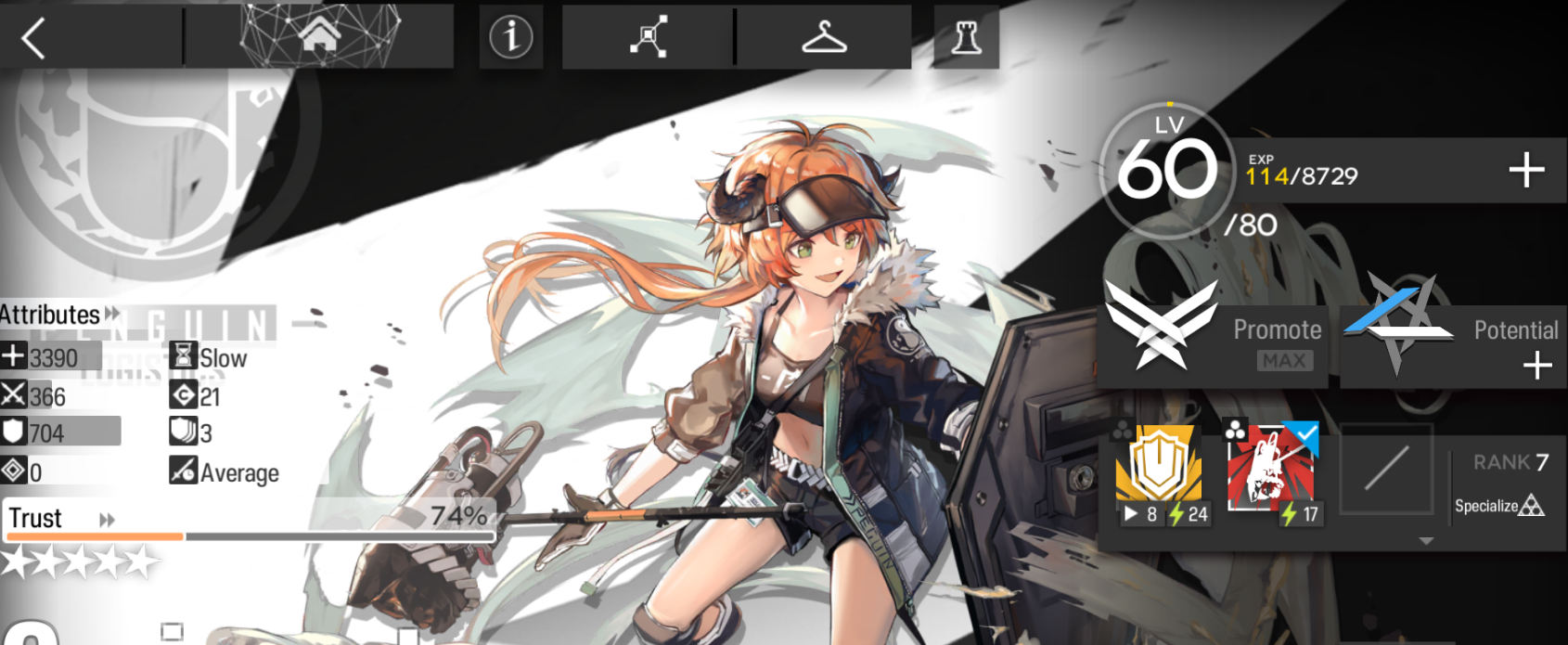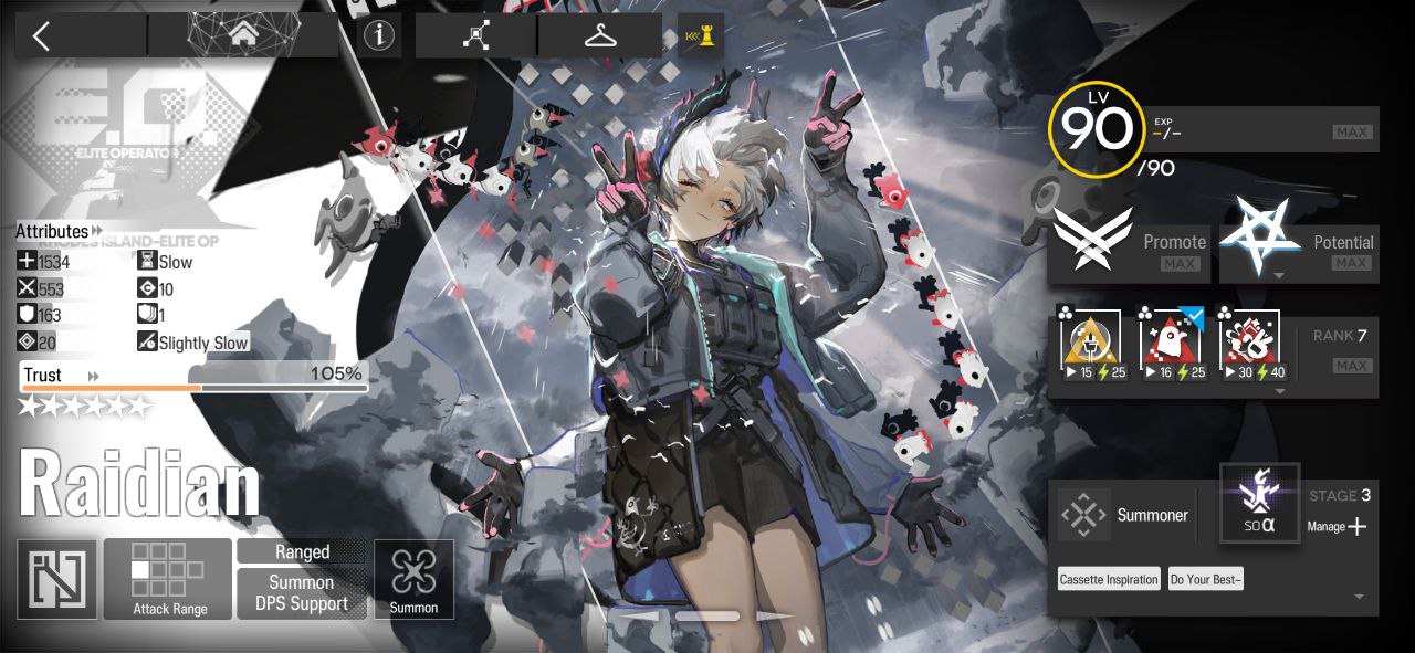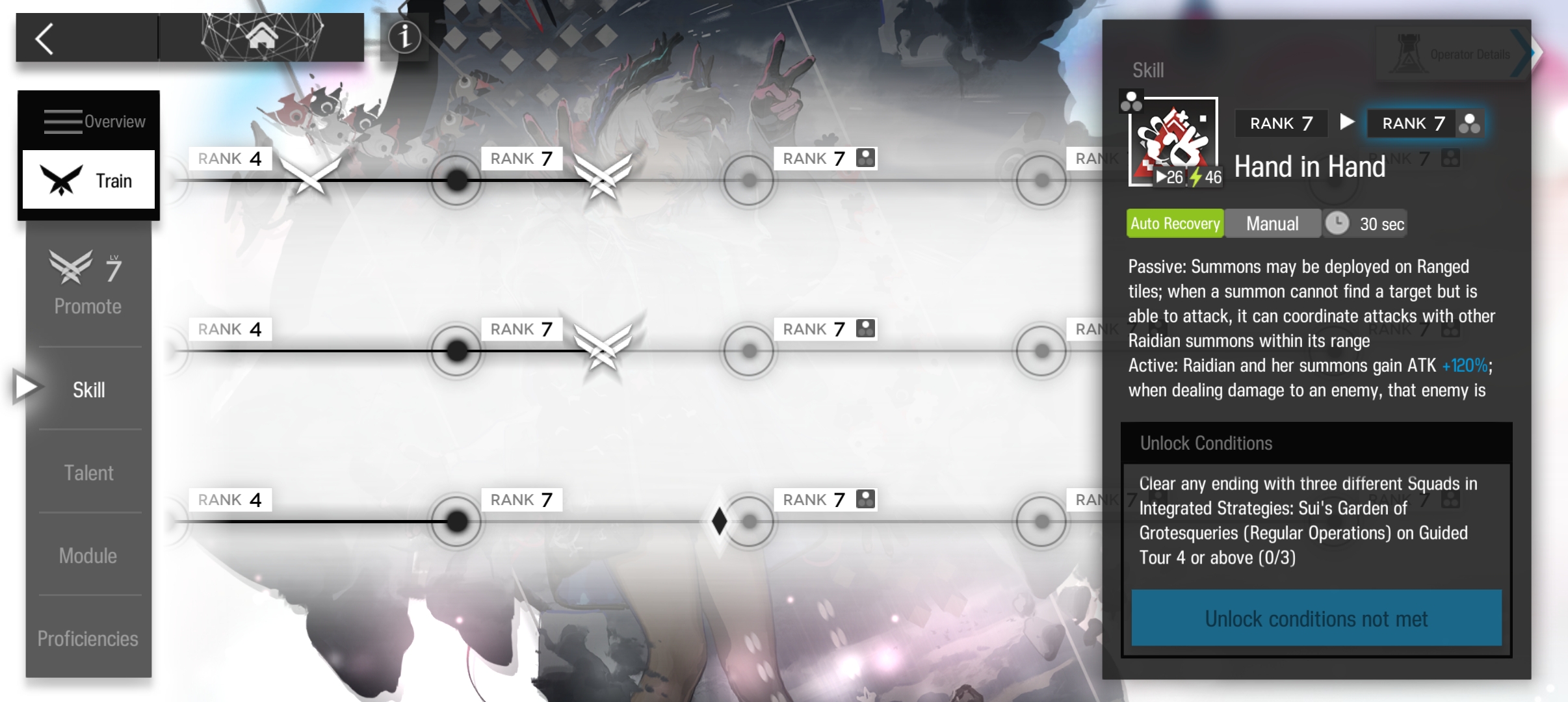 Skill 2: Stops attacking, ATK increases, puts this unit and the Operator in Attack Range with the lowest HP% to Sleep until the skill ends, whilst also continuously putting enemies surrounding this unit and the Operator to Sleep, Talent 1's effect increases to a few times, skill can be manually deactivated (Skill can be halted at any time while active)