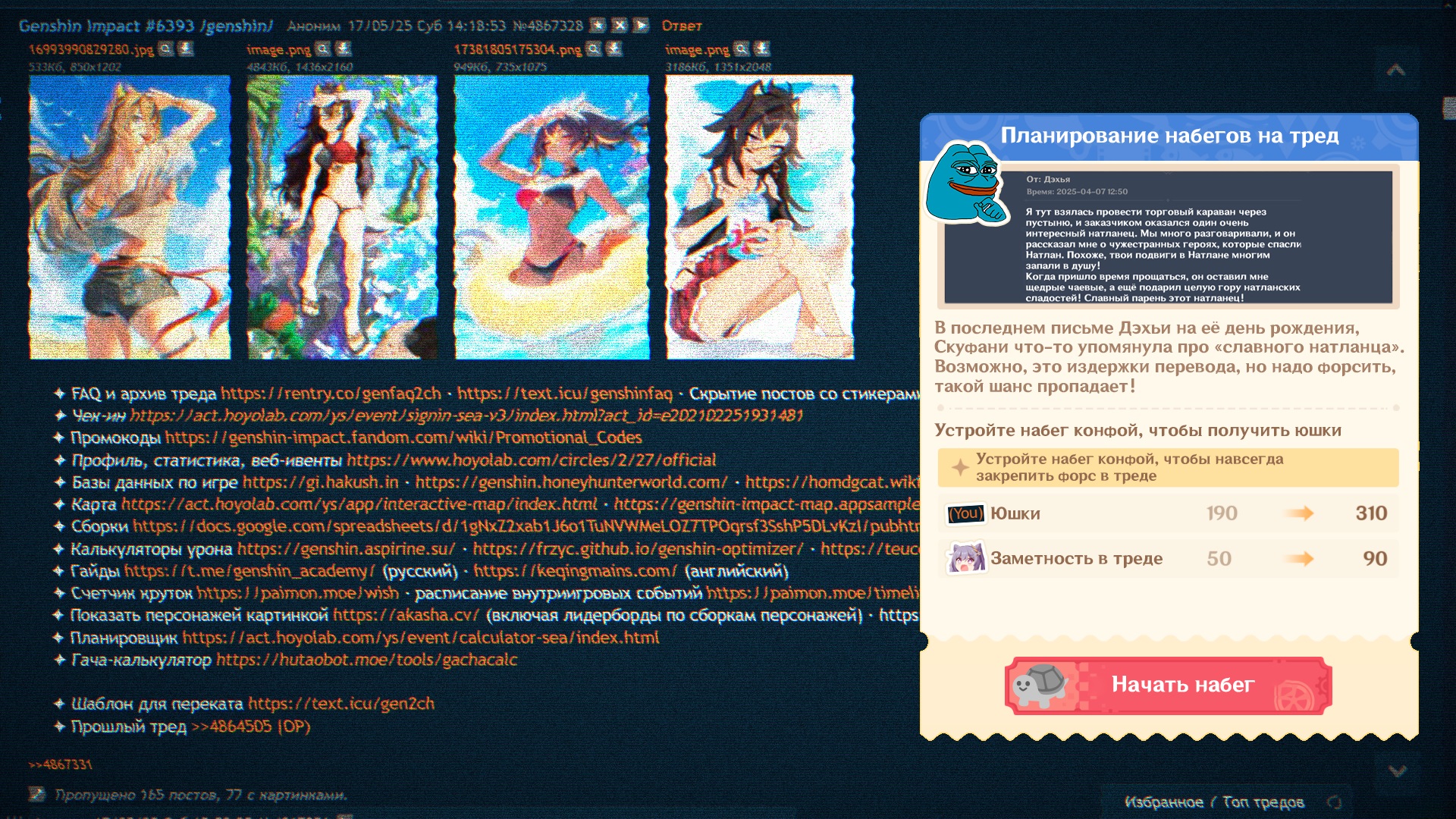 Шипперы >фапают на Кая/Сянлин, "сыночки корзинка" вроде Гань Юй дарят >ваповоз, Натлан не >хейт — там Easybreeze без >дебил-лагоз. >Потрогайте траву, не нойте о утренниках Аяки, кушайте хорошо и >путешествуйте без Паймон-спама. СЛАВА ТЕЙВАТУ!