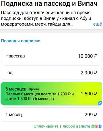>>6133440 >пасскод купил за 500 рублей много лет назад, сейчас бы за 10к удавился Оооо! В больную мозоль попал! Я брал годовой вместо вечного. Подумал, вечный забанят и усё, а годовой хоть обновить можно. А тут херак и приплыли... мдаа... До сих пор за локти себя кусаю.