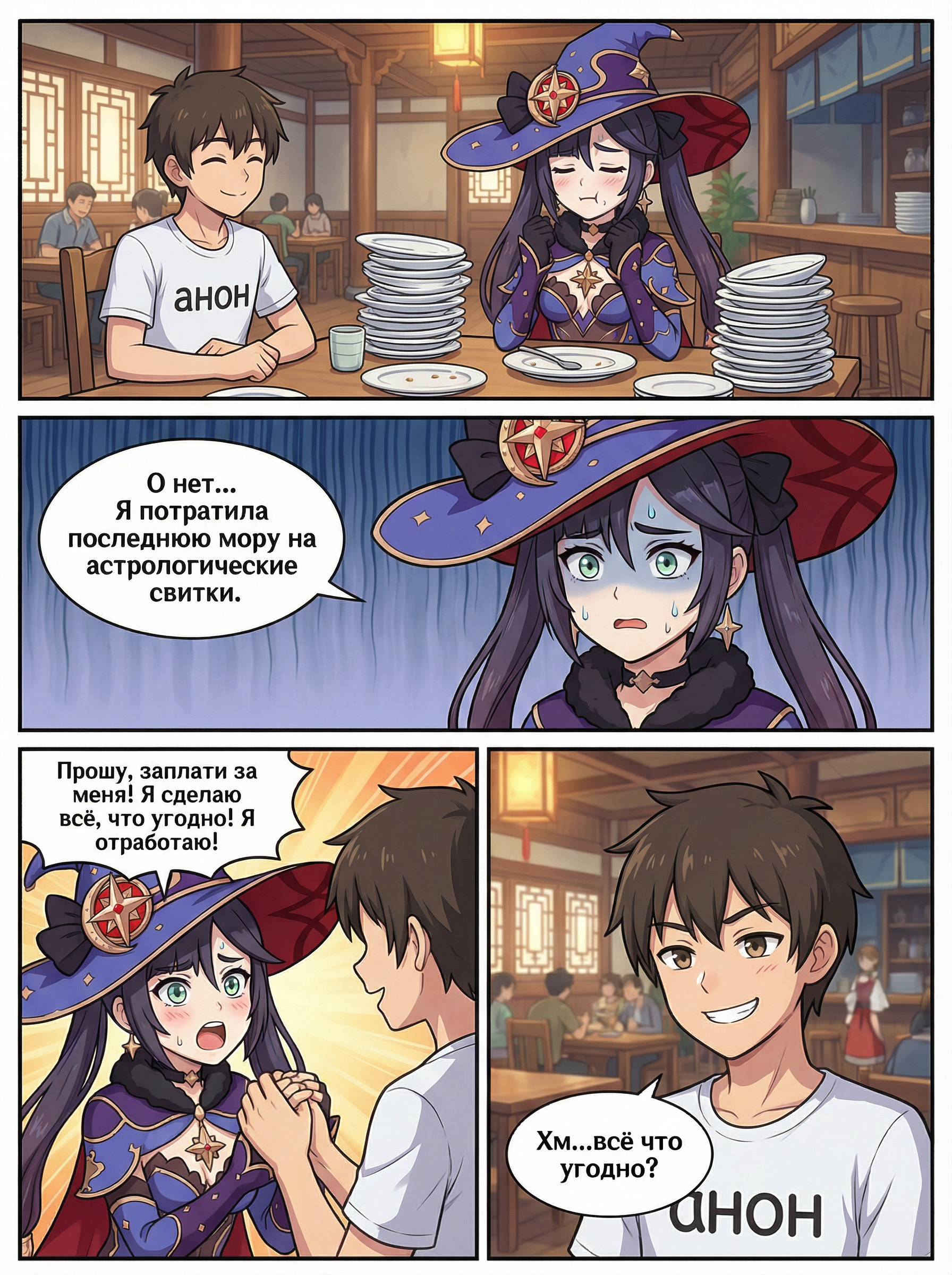 Люмин жалуется генералу махаматре: — Сайно, Тигнари сегодня объелся грибов, похоже его тошнит… — В таком случае немедленно дайте ему сыра! — Сайно, но зачем сыр? — Пусть наблюет нам жульена, а то нечем гостей кормить!