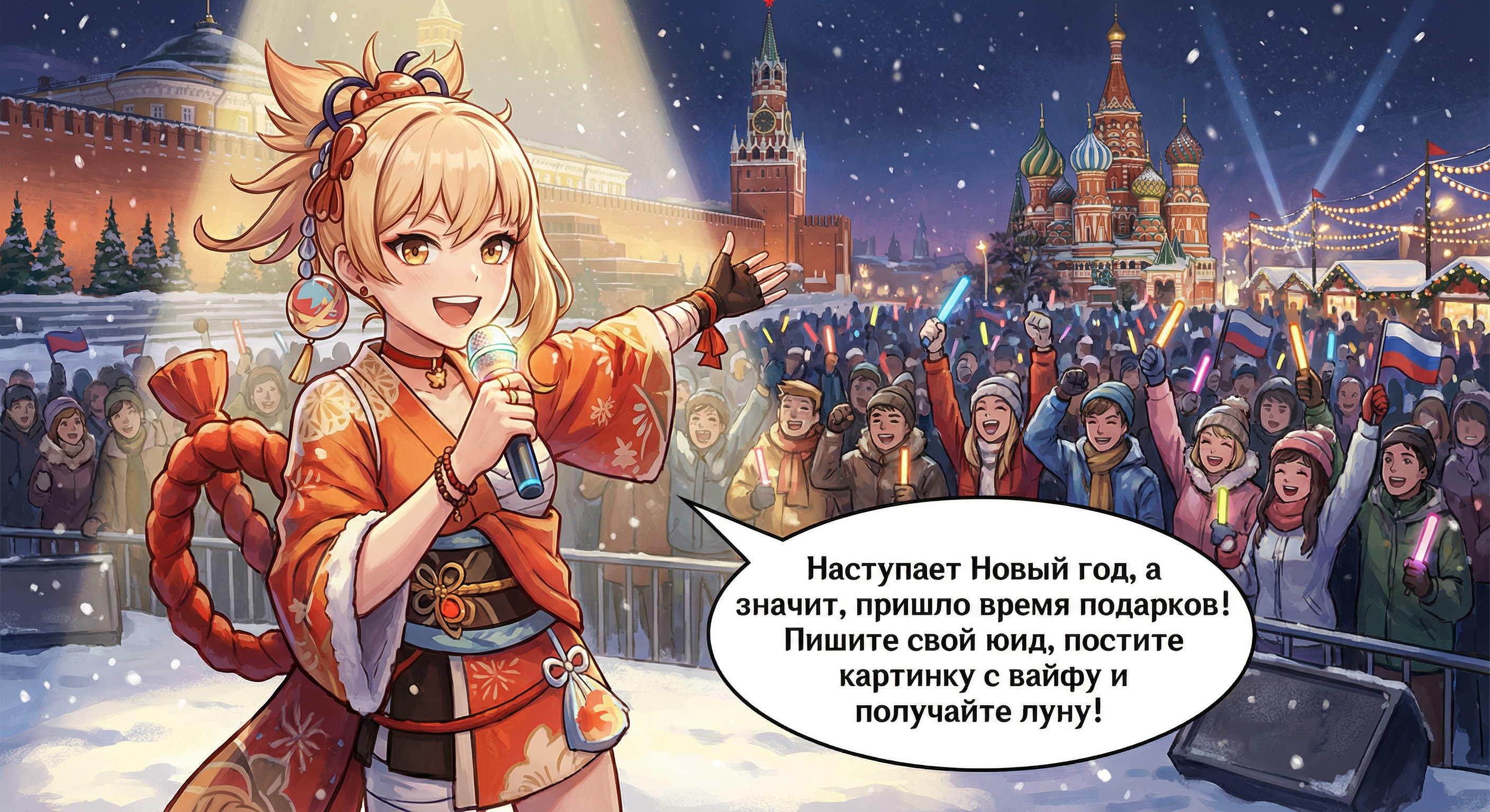 Наступает (или уже наступил) Новый год, а значит, пришло время подарков! Пишите свой юид, постите (по желанию) картинку с вайфу/хасбендо/любимым персонажем и получайте луну!