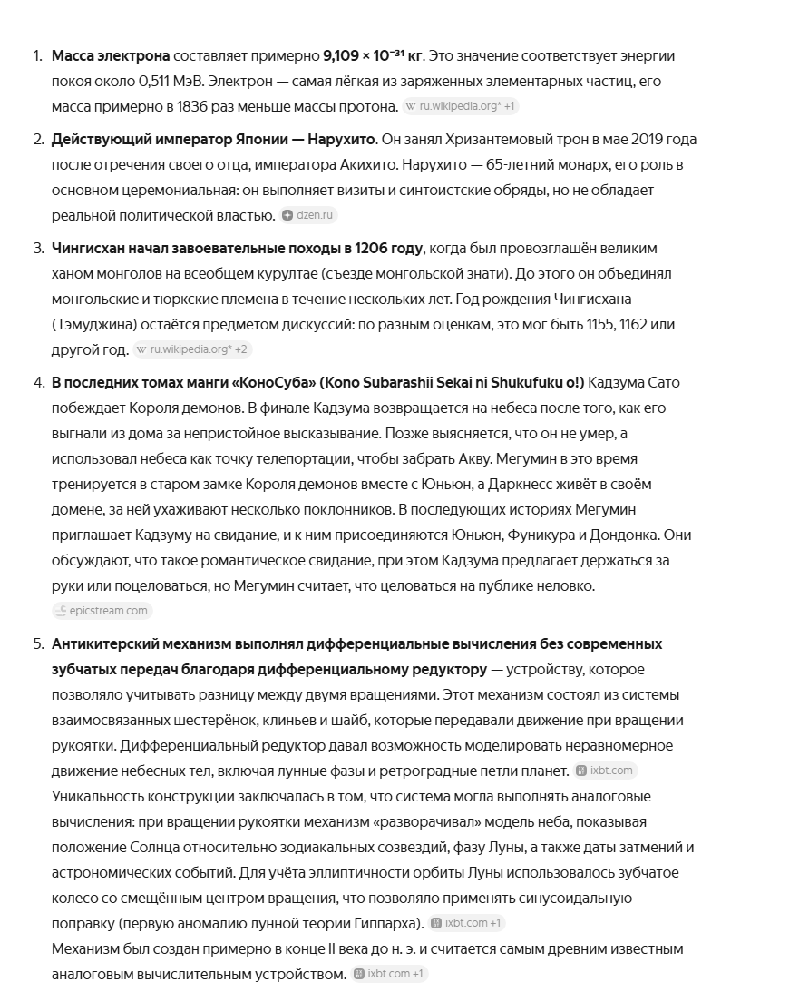 1. Масса Электрона 2. Императора Японии как звать 3. Во сколько лет Чингисхан начал завоевание 4. Что там в последних томах манги Коносубы 5. За счёт какого именно конструктивного решения антикитерский механизм смог выполнять дифференциальные вычисления без зубчатых передач современного типа?