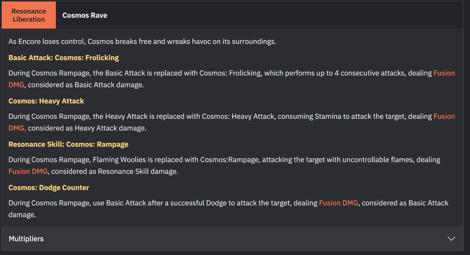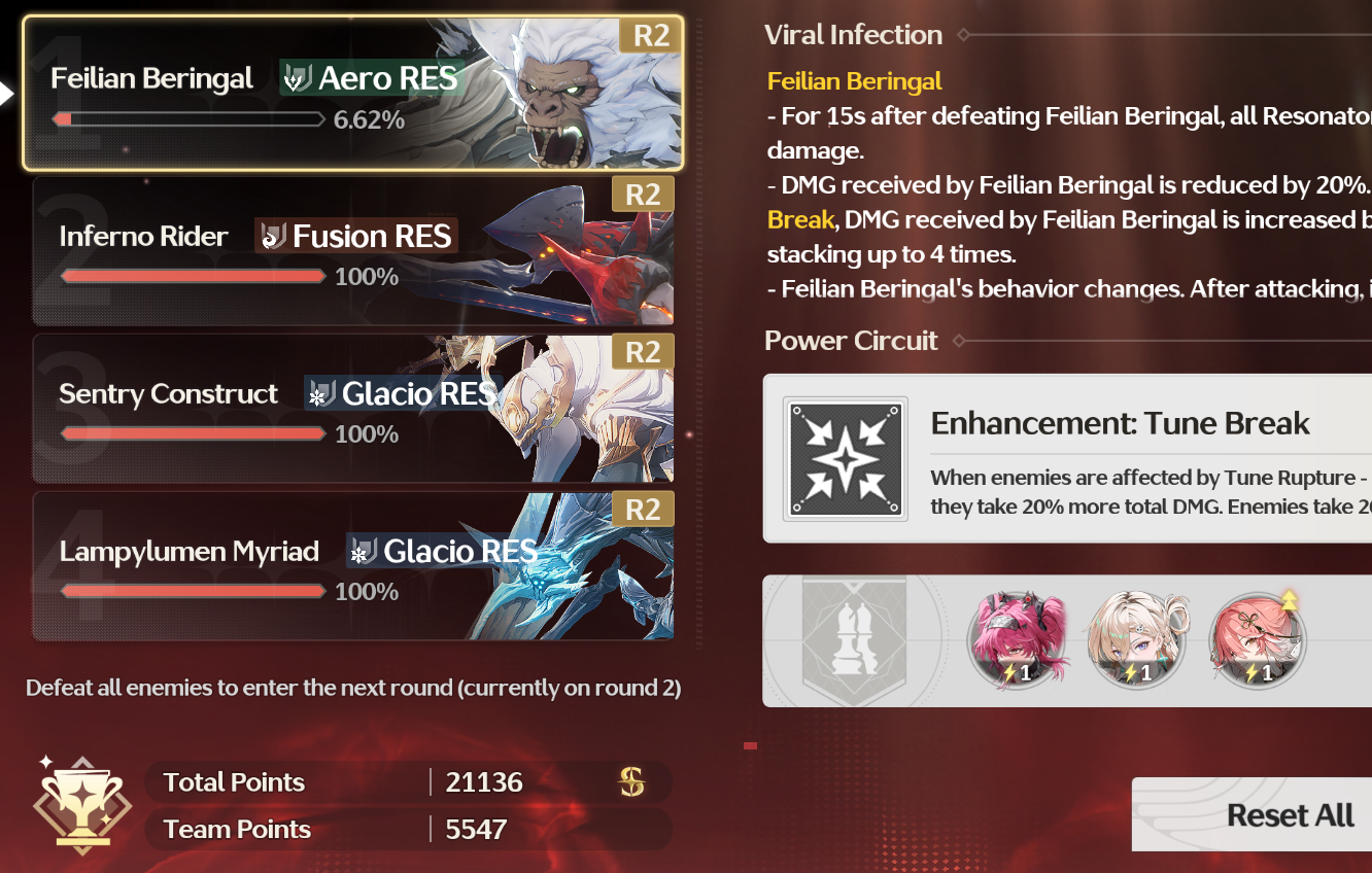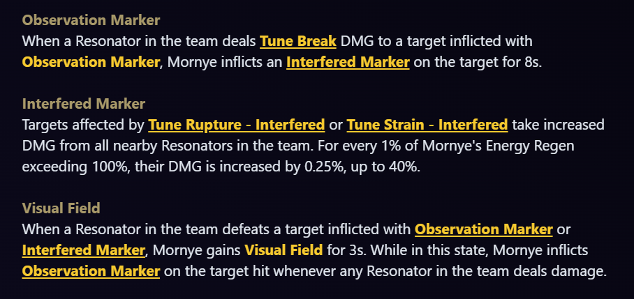 Interfered Marker Targets affected by Tune Rupture - Interfered or Tune Strain - Interfered take increased DMG from all nearby Resonators in the team. For every 1% of Mornye's Energy Regen exceeding 100%, their DMG is increased by 0.25%, up to 40%.
