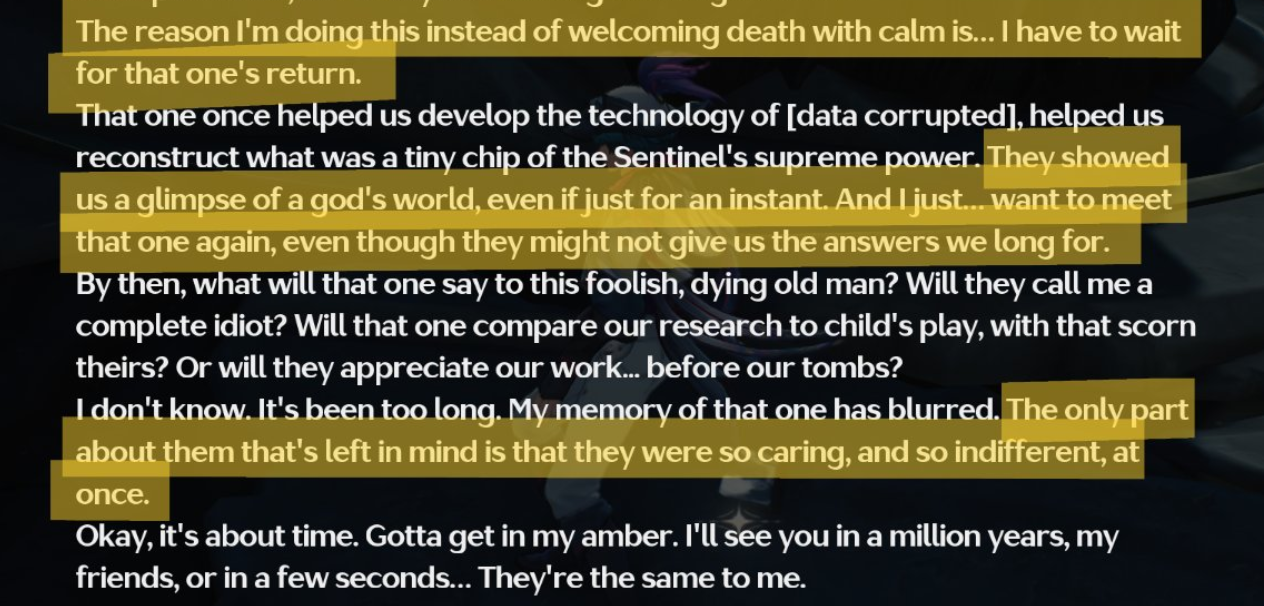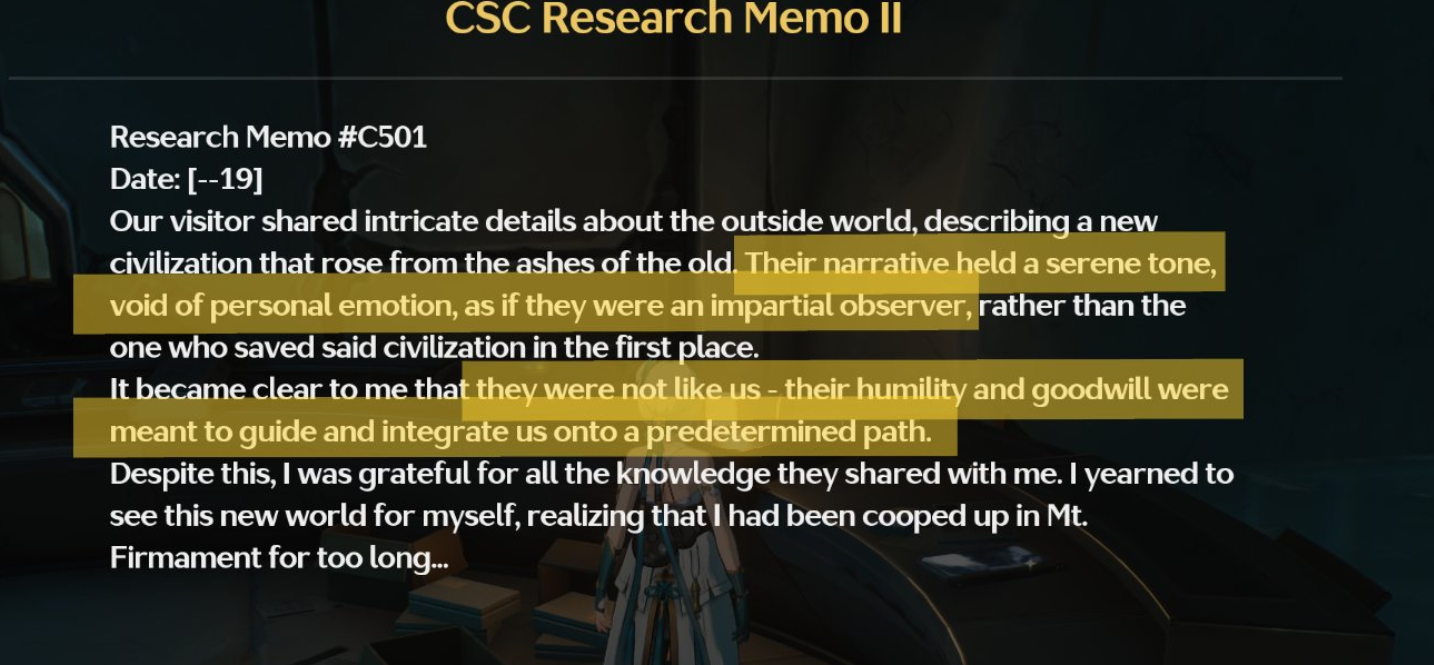 >>6159012 Это реально. У меня только пикрил был от этого, остальное уже забылось со временем. Но я тогда совсем в ахуе от этого лора. Как Ровер запечатлел конец предыдущий цивилизации, если в 1.0 писали, что он с амнезией проснулся, перед тем как опиздюлить краунлесса и основать Цзиньчжоу? Внезапно все снова узнал-познал и дединсайднулся.