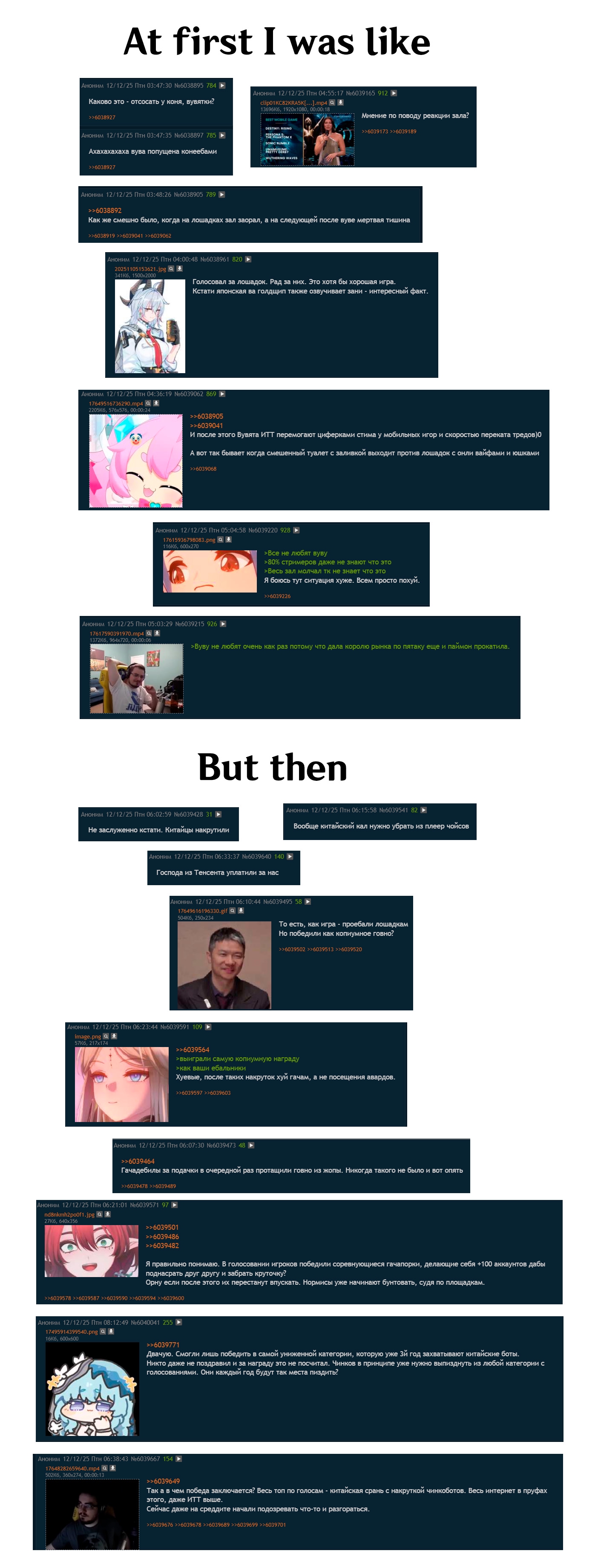 >>6160030 Я понимаю, надо выдумать перемогу, но не надо так. Всем похуй на плеерс войс, ее объявляют мимоходом как и другие такие же номинации, за нее даже не дают статуэтку, а после премии все обсуждают только Игру года, потом уже другие полу основные премии.