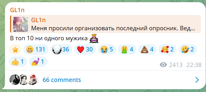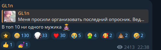Ты читать умеешь? Написано же - распространите. И да на борде многие как минимум следят за тг Глины, он при всей своей пидорковатости генерирует неплохой контент и новости. Вот эти опросы вышли интересными в целом.