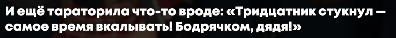 >>6169159 Дядь, охраннику, как и тебе, 30 на вид, Бернис ему и говорит заебанному, охуел что ли? 30 стукнул - работать, сука, солнце еще высоко, а для бодрости въеби нитротопливка!