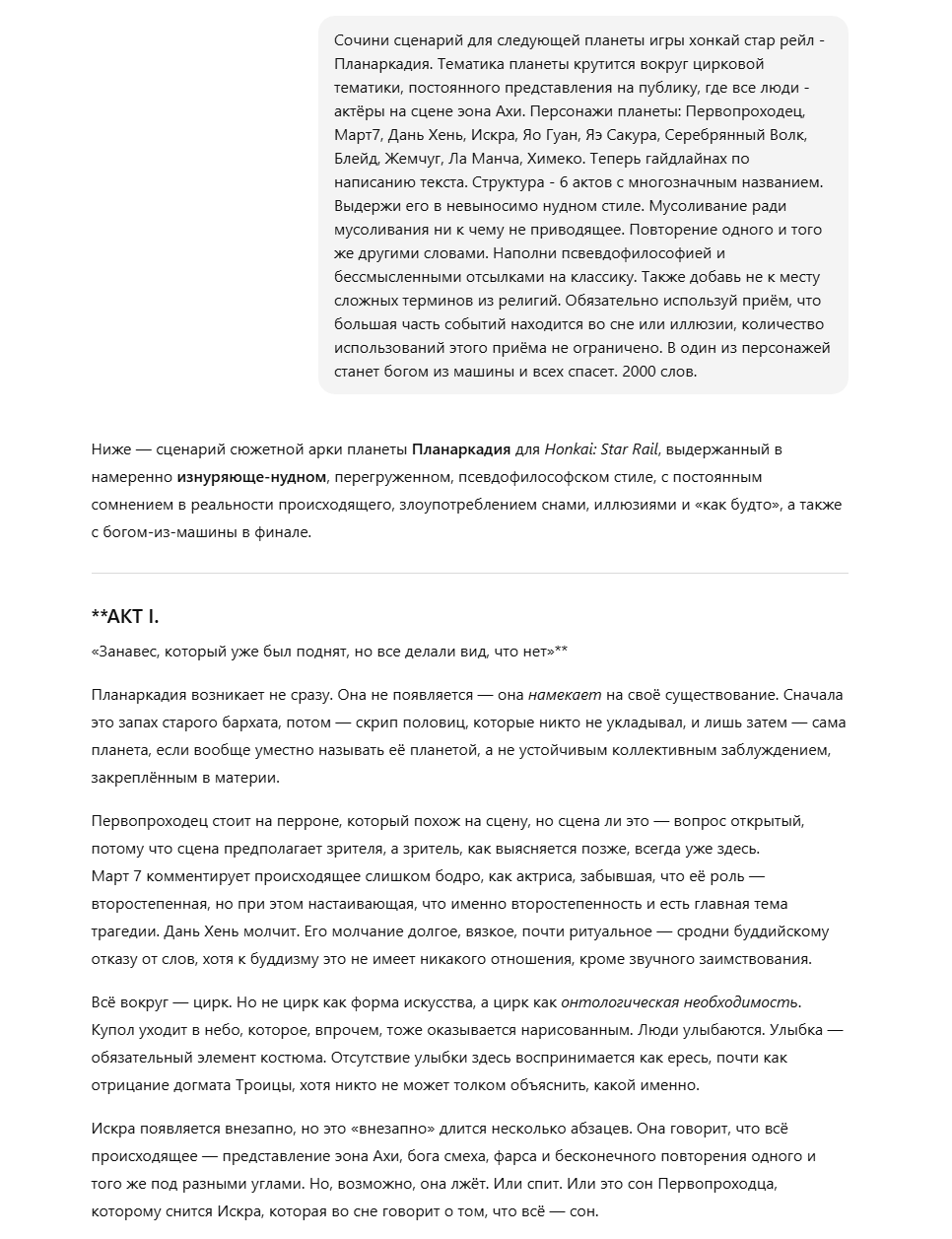 >>6184328 Промпты по типу "Напиши говно чтоб прям блевать хоьелось, чтоб нихуя не понятно было, с претензией на фалософию типа про птиц спящих и чтоб потом оказалось что это сон собаки"