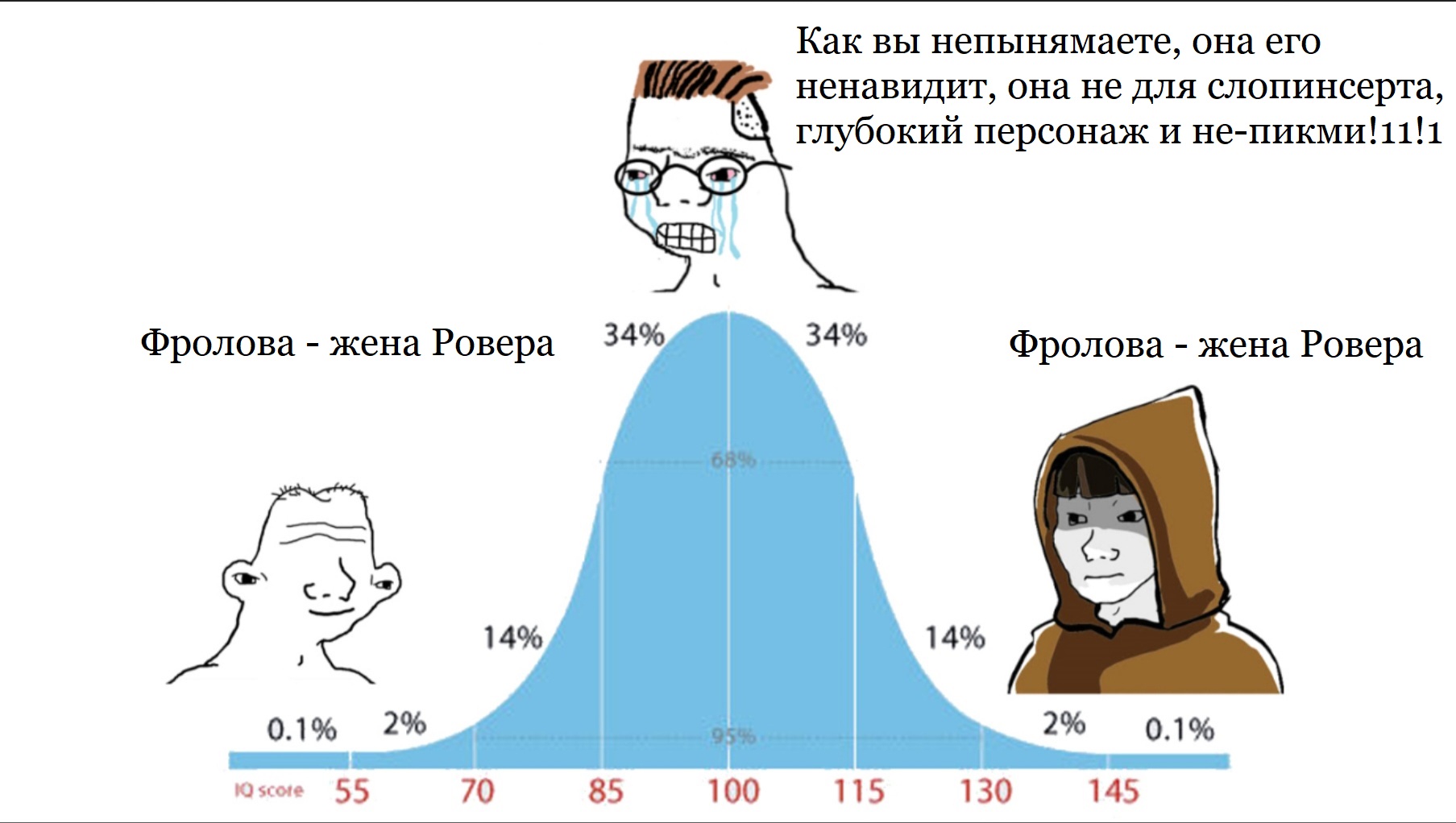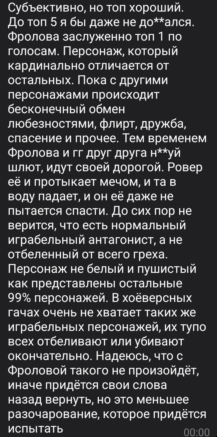 Даже он понял, если вы понимаете о ком я. В ближайшем расписании Вувы пока не видно, так что подведу итог. Топ по подаче - арка Лупы. Топ по сюжету - арка Фроловы. Последняя приятно удивила концовкой. Оказывается, можно делать вещи, которые традиционно любая гача игра избегает. И даже вышла почти адекватная "серая" мораль. Почти, потому что многие мотивы персонажей до сих пор не раскрыты. А Ровер мразота, кста.