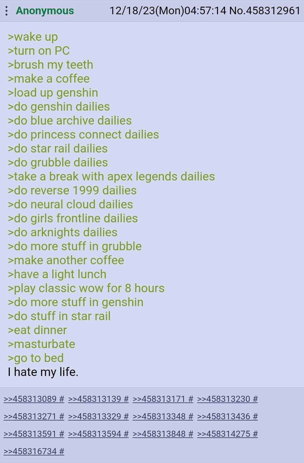 Имагине играть сразу в несколько гач и тебя кормят одними и теми же персами с одинаковыми анимациями еще и сраться приходится в треде за первенство баренов, тяжела жизнь гачаедов
