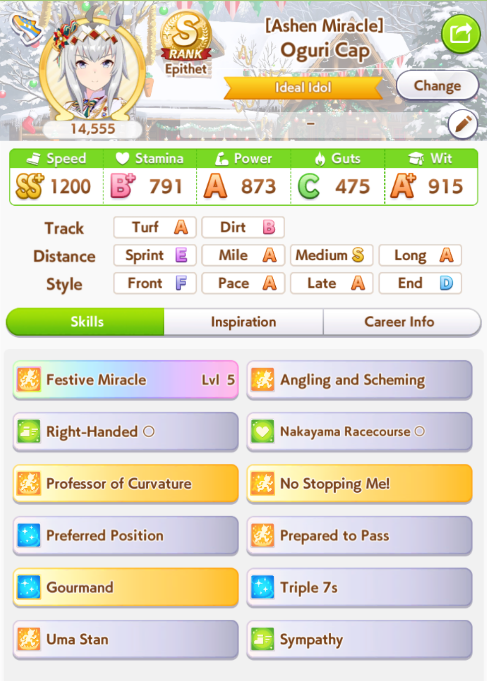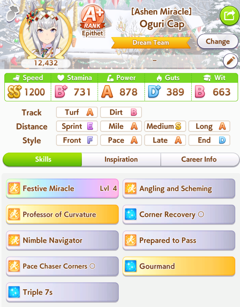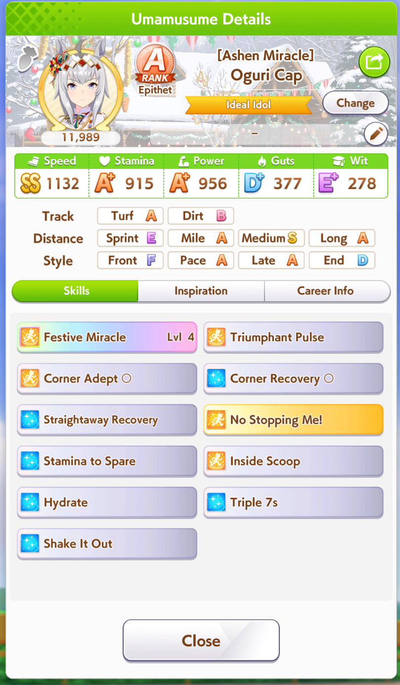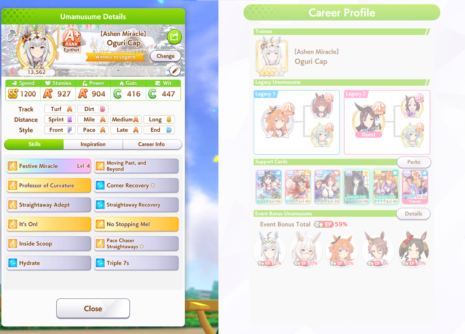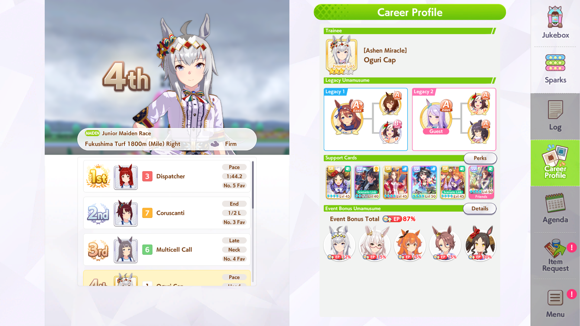 Я играл 4 последних дня только Огури. 12 ранов. Всегда получал секретную награду. Иногда она может проебать Хеншин, но там 2-4 место, это поебать, так как тебе надо 3к фанатов, а с них набивается. Пару раз второе место было на осенней миле перед Арима кинен.
