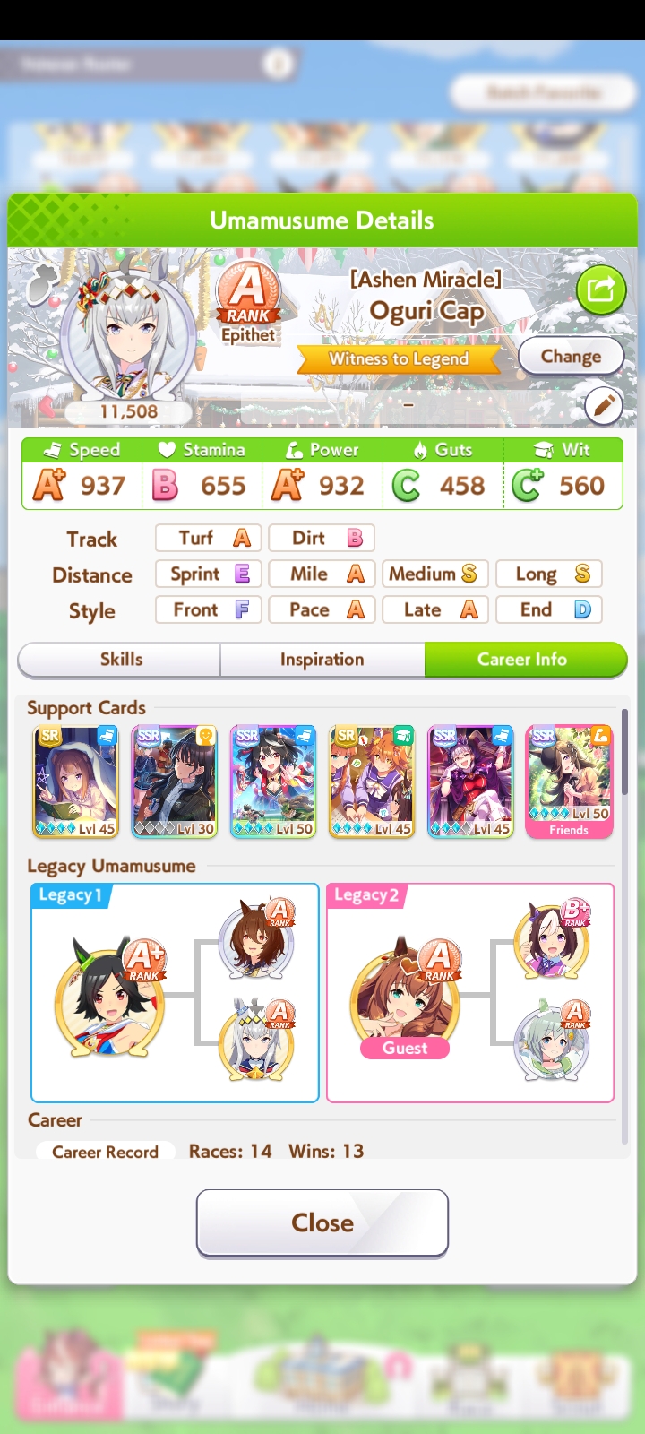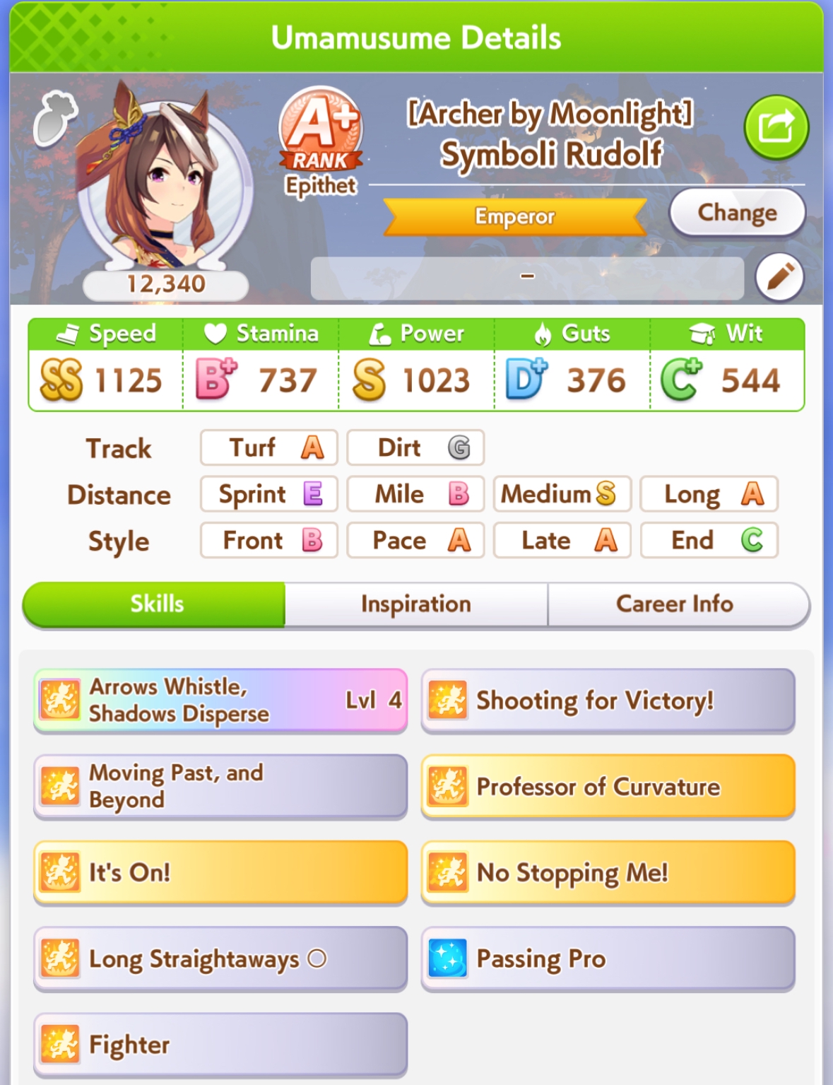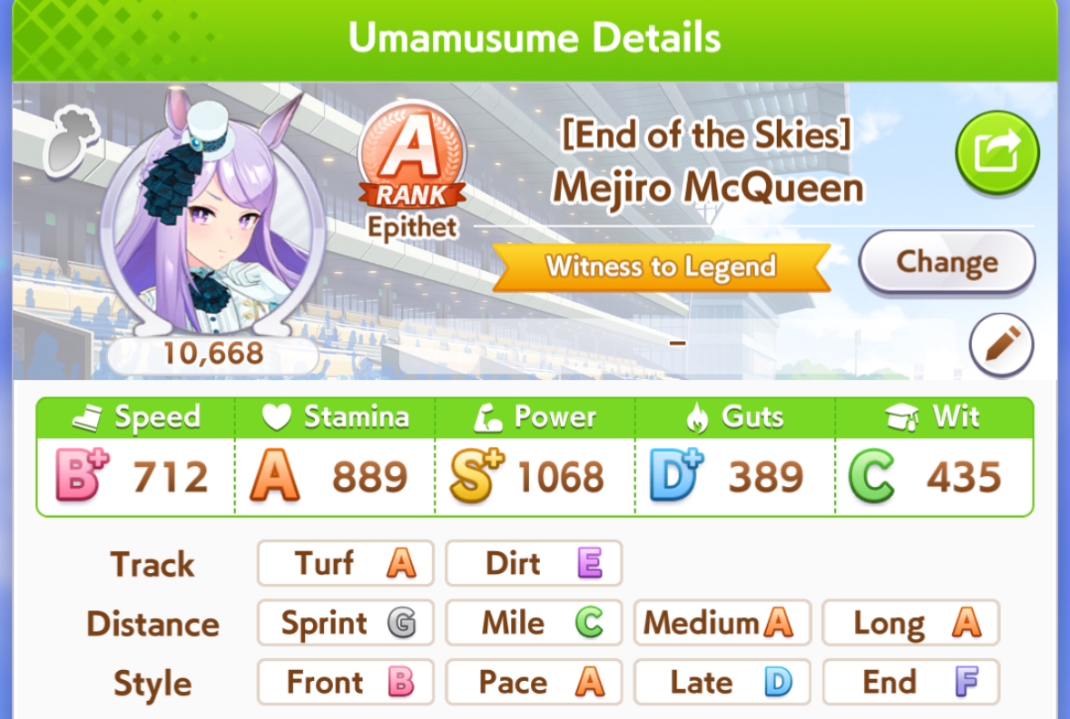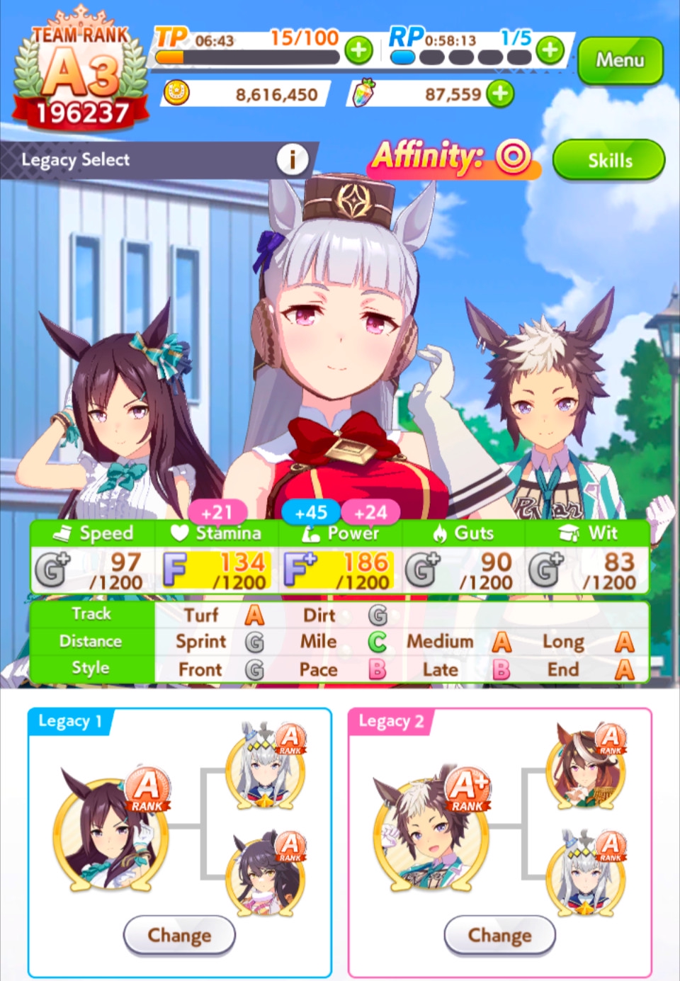 >>6195711 >>6195683 Вот что у меня. В 90% прихожу к финалу Аохары с A арнгом команды и треугольниками, ординарными кружками к "Зениту". Про S на дистанцию или хотя бы Turf я вообще молчу. Были только такие как на пиках с 2 по 4. В общем всё совсем печально и походу даже в B группе ожидается посос, на А я даже не мечу с такими тренями