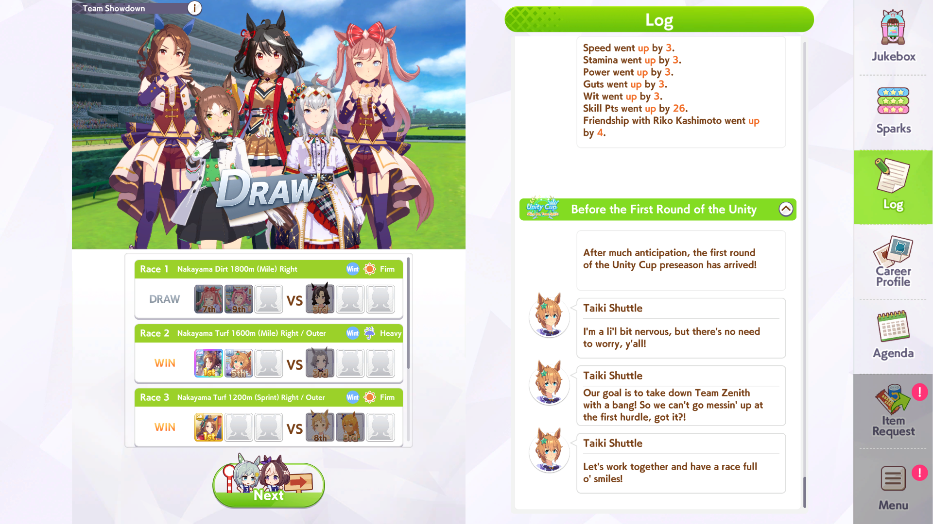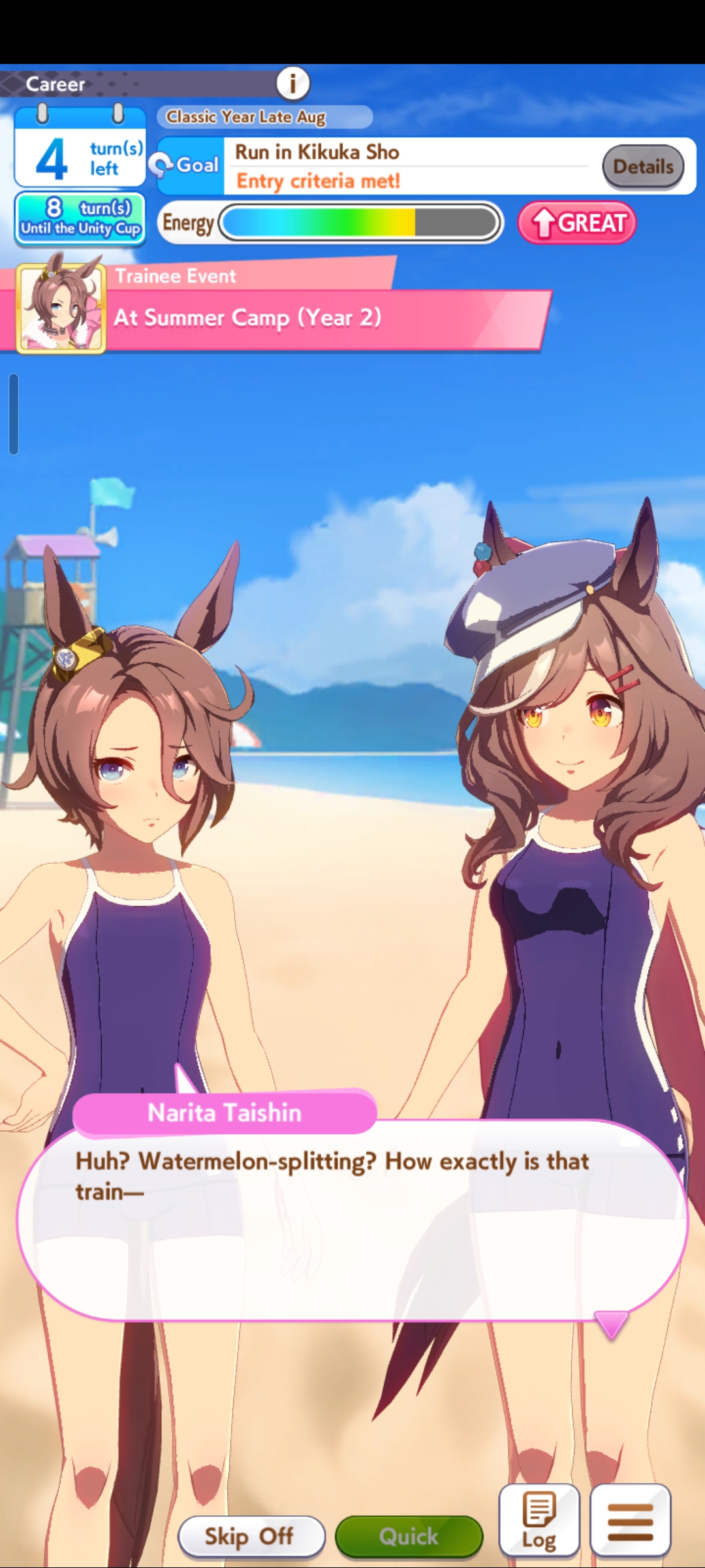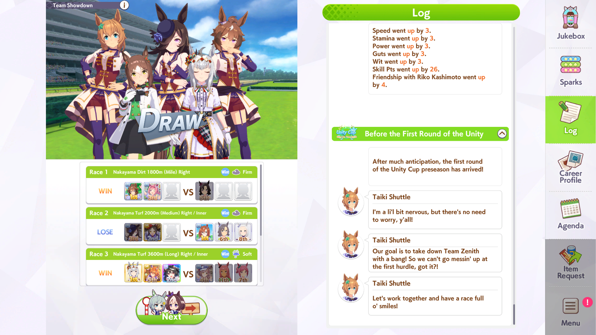 На первой команда неполная, и обычно только Тайки Шатл на миле и только Урара на грязи. Если они вообще не приходили за паверапами, то лучше скипать и засейвиться медиум соперниками Но вообще жать на сильных соперников в начале очень хочется т.к. ты дальше по карьере плавно выравниваешь тиму и сноуболлишься по другим этапам, и в конце у тебя есть возможность скипнуть ёбырей из Certain Victory и все равно залутать максимальное +50 усиление. А если скипнкшь первую то можешь попасть на Turf Queens на предпоследней, и тебя трахнут