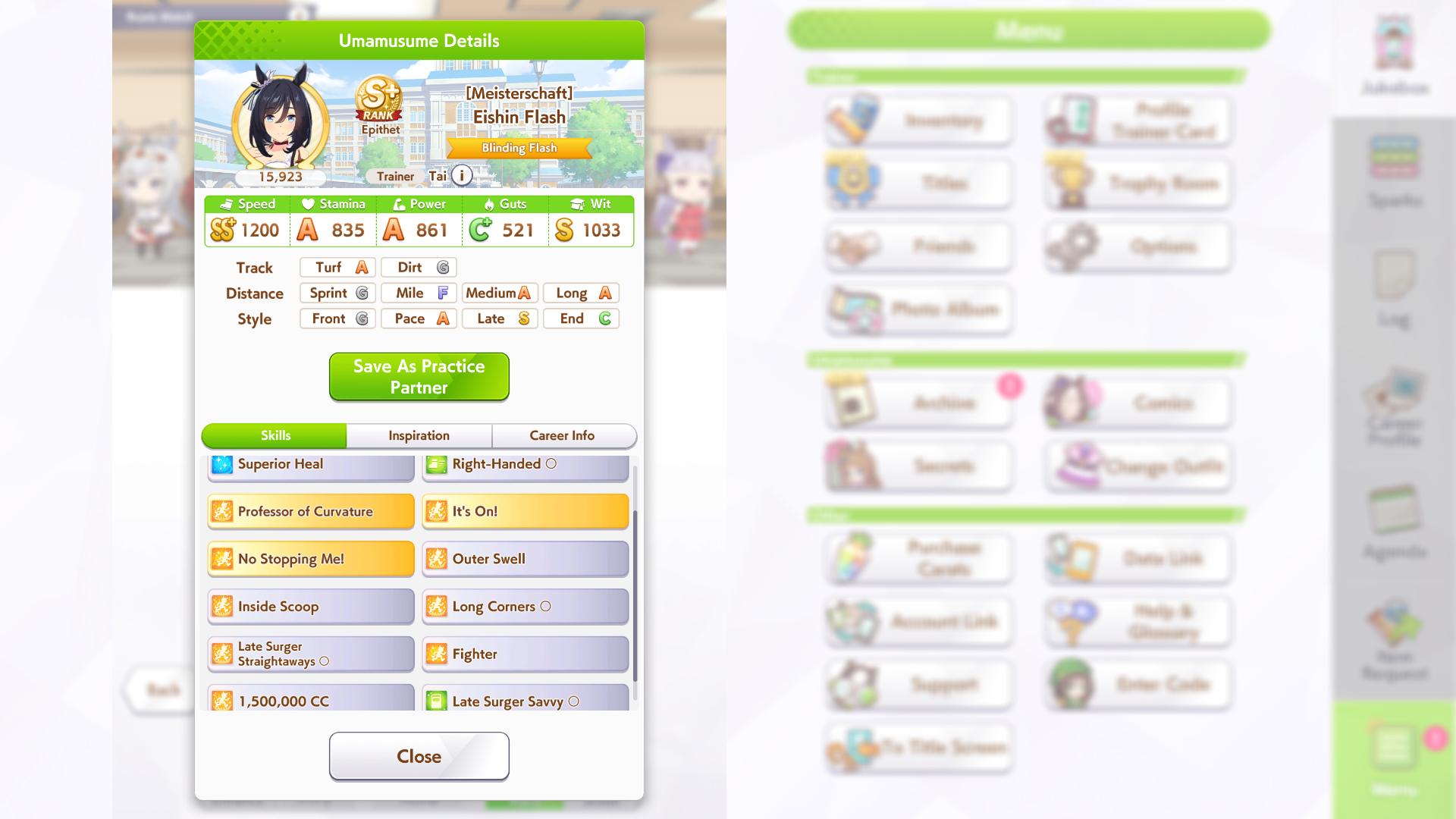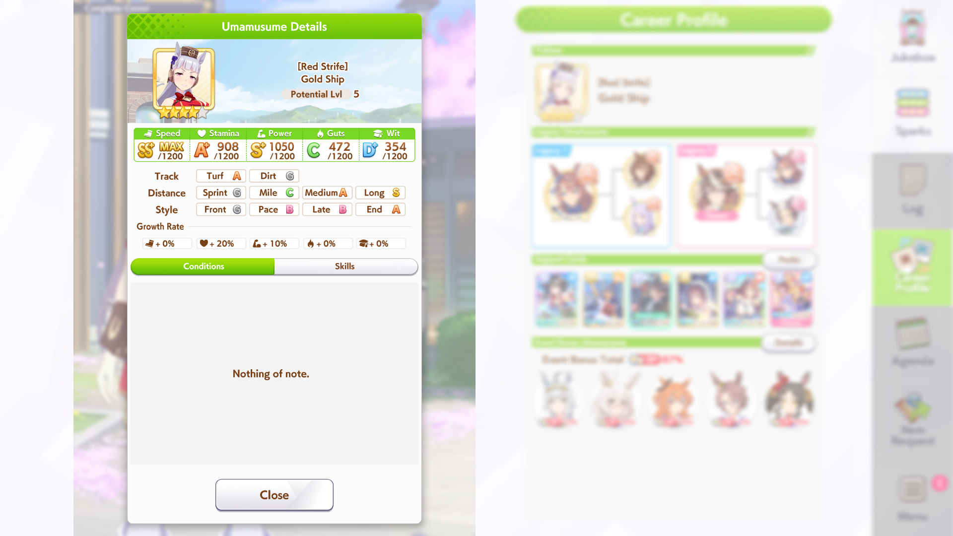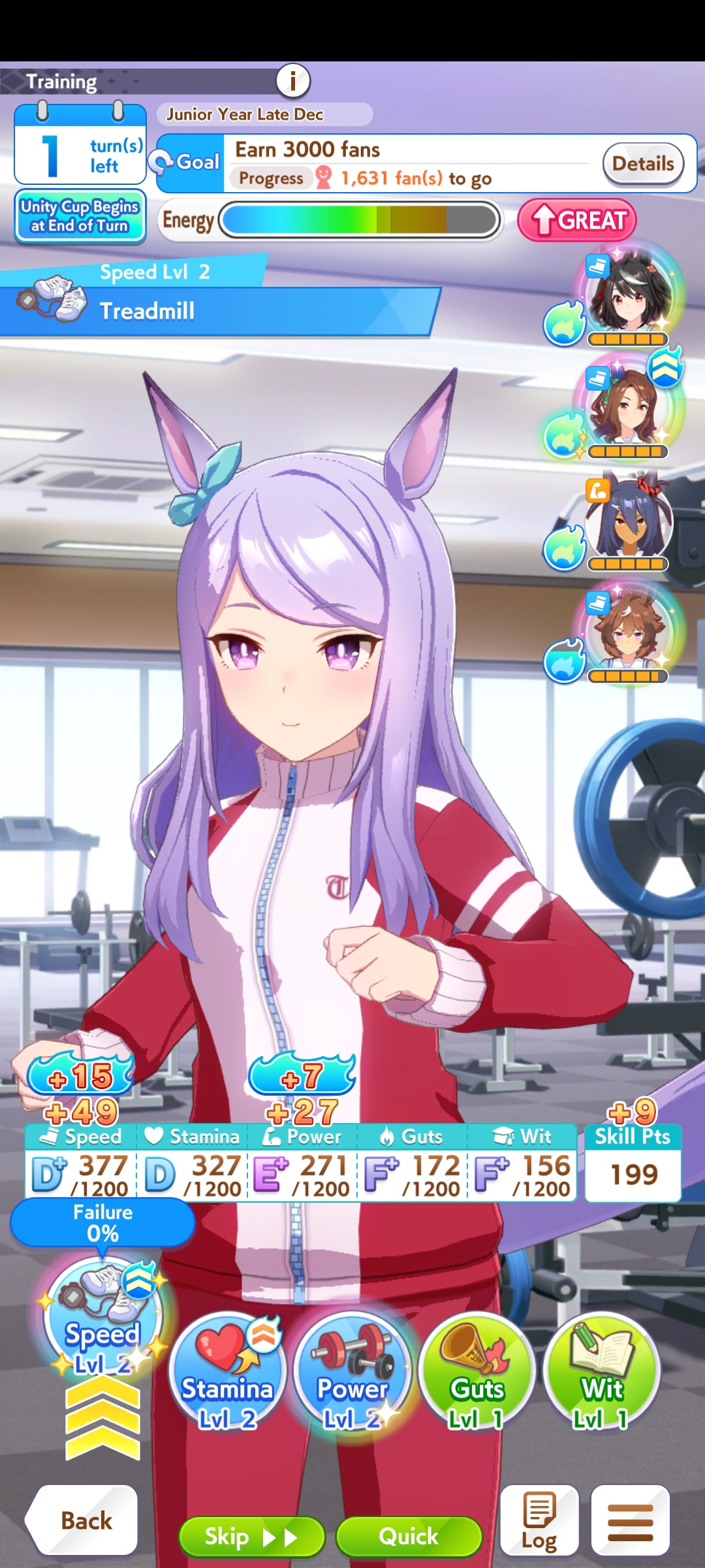 На первой команда неполная, и обычно только Тайки Шатл на миле и только Урара на грязи. Если они вообще не приходили за паверапами, то лучше скипать и засейвиться медиум соперниками Но вообще жать на сильных соперников в начале очень хочется т.к. ты дальше по карьере плавно выравниваешь тиму и сноуболлишься по другим этапам, и в конце у тебя есть возможность скипнуть ёбырей из Certain Victory и все равно залутать максимальное +50 усиление. А если скипнкшь первую то можешь попасть на Turf Queens на предпоследней, и тебя трахнут
