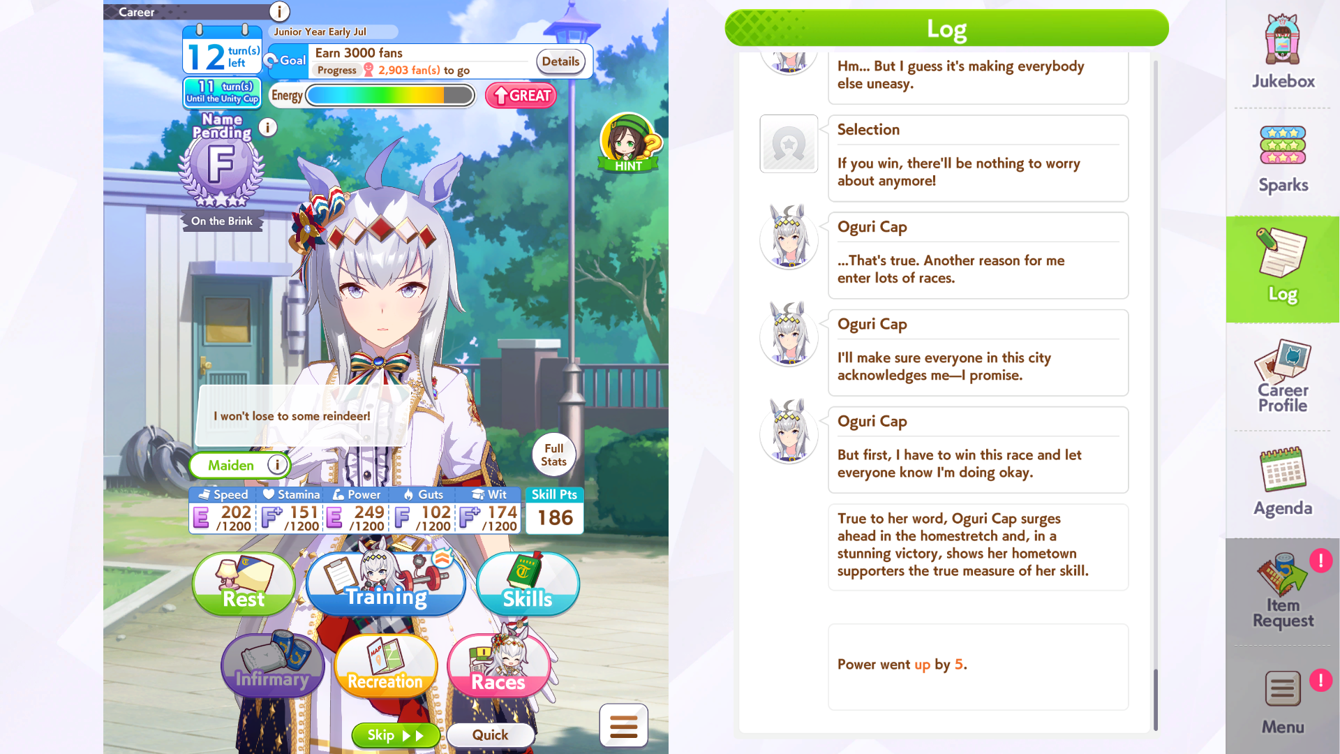 У кого-то такая же трабла есть и как вообще можно её пофиксить? Статы к первому пляжу обычно выходят около 500-600 скорости, ~200 стамины, чуть больше силы, ~180 гатс и 300-400 вит. Вроде нормально, но она почему-то всёравно стабильно не может брать первые места. Ставил её фронтом - стало только хуже, там как раз первые два джуниор проёба былина фронте. Вчера попробовал ставить лейтом на Хоупфул Стейкс и она вообще вроде на 11-ом месте закончила из-за чего я проиграл карьеру. Очень боюсь, что либо придётся скипать Огури и не качать её потому что так плохо идёт, либо также продолжать пытаться долбиться чтобы она каким-то чудодейственным образом стала побеждать в гонках, пусть я пока и не понимаю как именно.