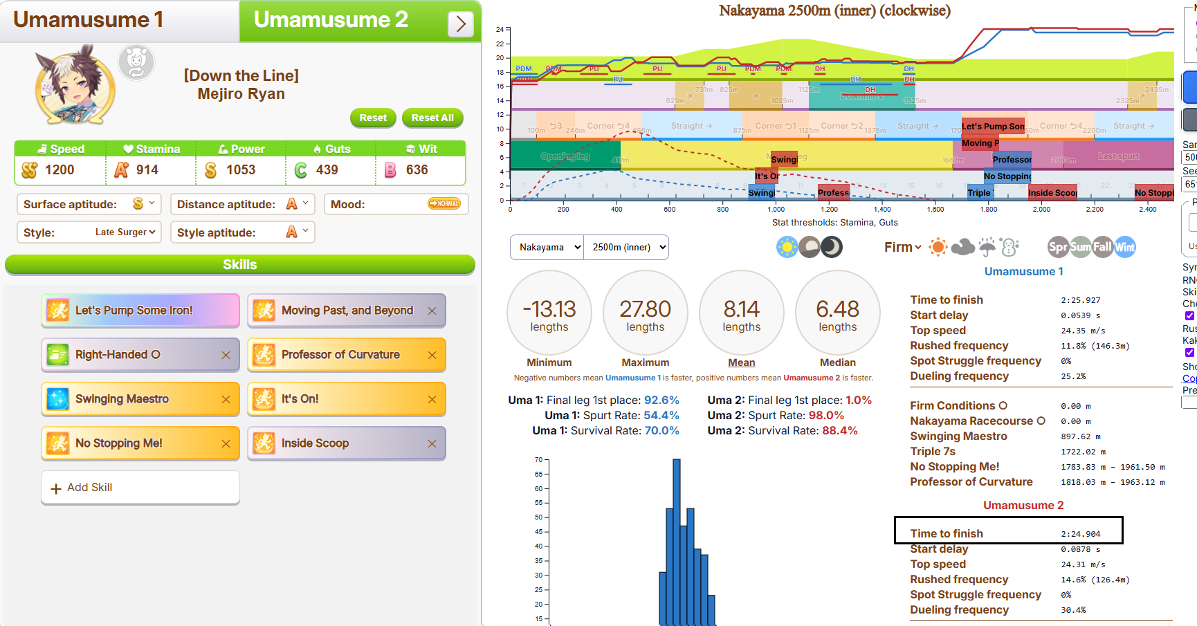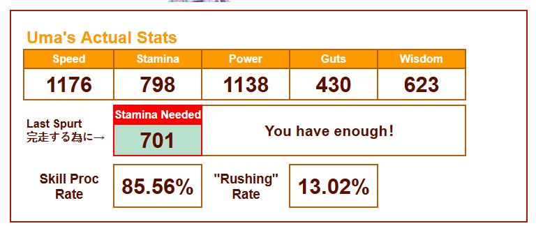 >>6202136 Да я просто щас вбил параметры и прям впритык показывает, что немного ссыкотно Окей, тогда вопрос такой: Если стамины вот так вот выдаёт, то лучше взять Be Still сверху или на похуй оставить Хоумстретч? Из рекавери у меня ничего другого лучше этого варианта под лейт нет попросту. С Би стиллом показывает что всё заебись. Учёт проводил при наихудшем раскладе, т.е Bad mood на пару с Rushed. Ещё в симуляторе спурт рейт даже до 90 не поднимается, хотя помню, что говорили, мол, этот параметр должен сотку или хотя бы наиболее близко к ней находиться, вот и интересуюсь. Просто это вообще лучшая Райан, которую я делал и не хочется проёбывть хоть какой-то потенциал на Ариму