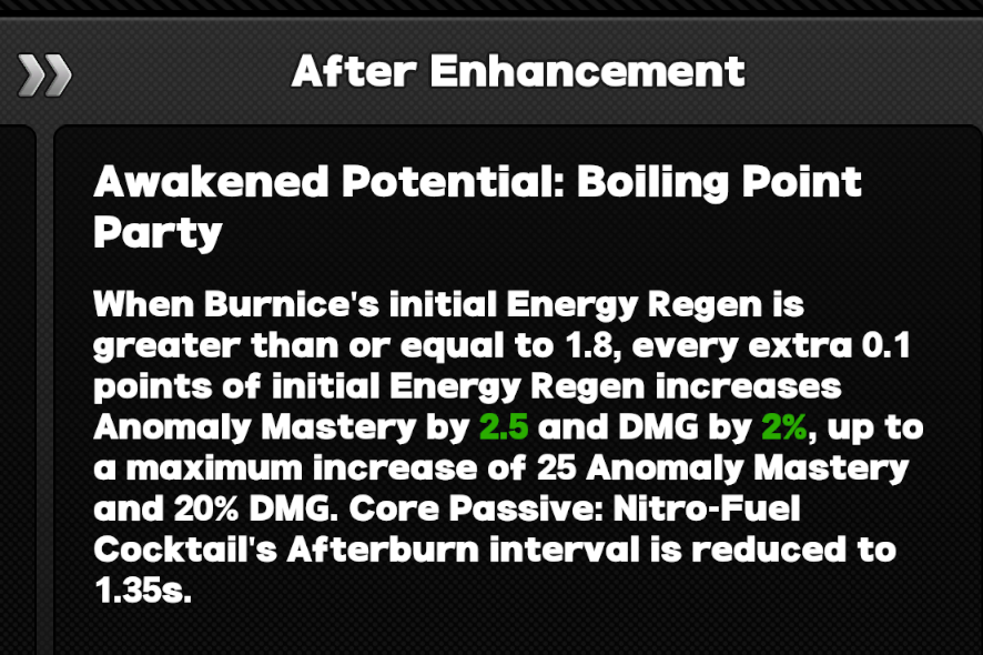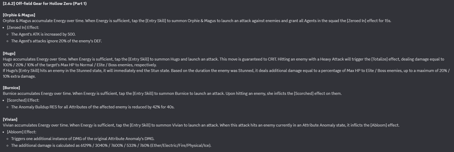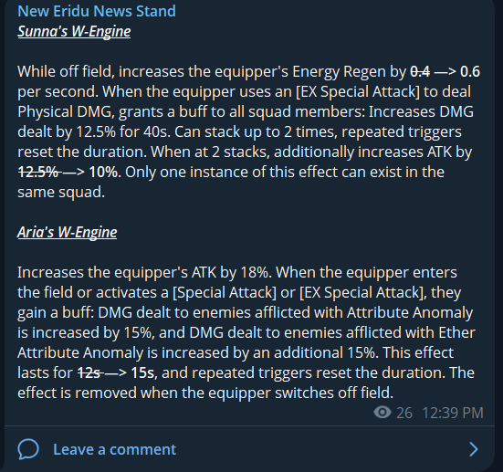V2 Hotfix 5 Changes Sunna Angelic Assistance duration 40 seconds -> 35 seconds Ether Veil duration 30 seconds -> 35 seconds EX Special Bubblegum Pop MV 2219.1% -> 1885.1% EX Special Bubblegum Pop Daze 744.1% -> 917.3% EX Special Bubblegum Pop Energy Cost 60 -> 75 EX Special Special Camera Technique Daze 750.8% -> 953.3% Core Passive Level ATK% 18% -> 21% Core Passive Angelic Assistance ATK buff 30%, up to 1000 -> 14%, up to 490 Cat's Gaze Attack Agent MV 210% -> 360% Cat's Gaze Anomaly Agent MV 210% -> 480% Additional Ability Stun Multiplier duration 40 seconds -> 35 seconds Additional Ability extra ATK buff 15%. up to 30, for 15 seconds, up to 3 stacks -> 8%,up to 280, for 35 seconds, up to 2 stacks