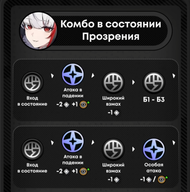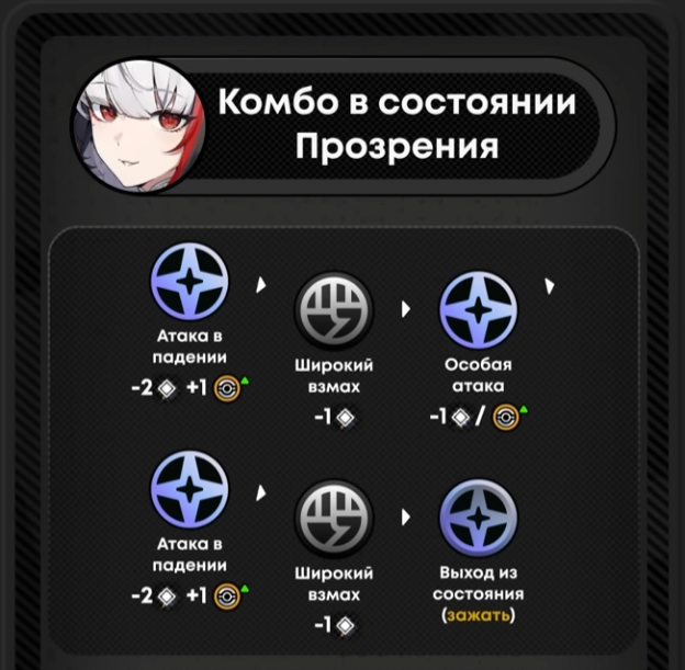 На самом деле у неё там несколько комбух, можно через 1 базик и падение, или через 2 базика и падение, зависит от того сколько времени тебе нужно. К примеру, ты знаешь что если дашь самую коротую комбу то у Диалинь не хватит пары сек на набор энергии для 3 ешек - делаешь комбу которая подольше, а если всё готово то сдаёшь самую быструю.