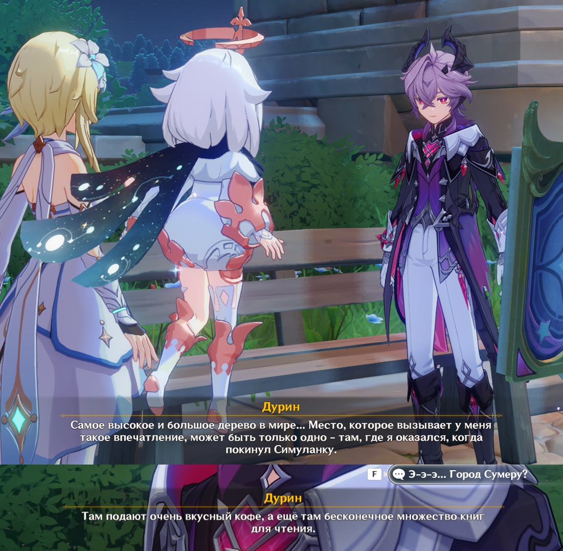 Я, кстати, так и думал, что речь будет про Сумеру. И уверен, что идея тут не о том гигантском дереве в городе, а об Ирминсуле. Даже если в игре его не покажут, он явно тут подразумевается в тексте... А так как в этом квесте затрагивается память людей, то всё на свои места встаёт. Дурина рили переписывают. Злого, имеется ввиду.
