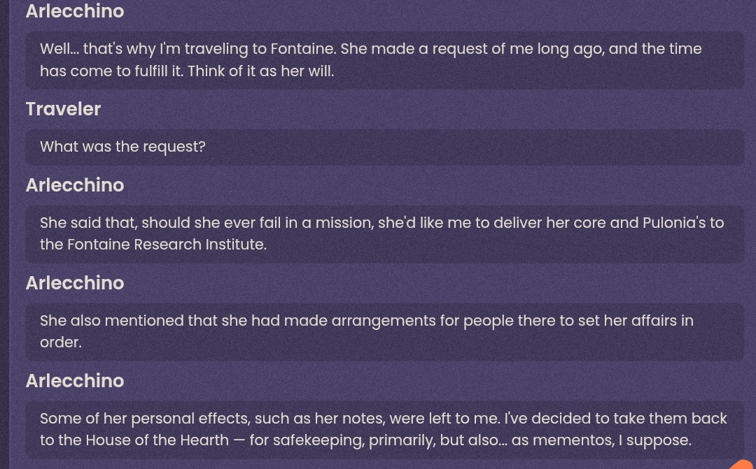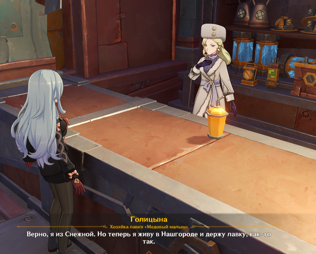В Снежной, когда я была Третьей из Предвестников Фатуи, у меня было много привилегий. Мне не нужно было покупать билет на поезд или стоять в очереди в Королевскую труппу... А ещё, когда я ужинала в ресторане, мне могли... "возместить расходы"? Для меня это было слишком сложно, поэтому я просто ходила туда вместе с Сандроне или Арлекино.