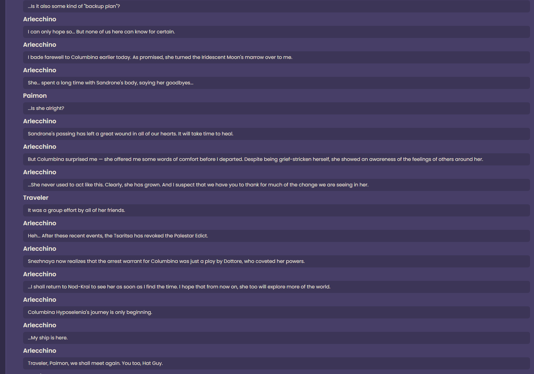 А если стримеров посмотреть, они вообще скипнули весь фан, кроме обязательного, Ашру не нашли, шоу роботов не посмотрели, миниквест с мелкими работами не прошли, и даже со зверушками из Симуланки не сыграли. Я уж молчу про конфеты от Колумбины, там вообще мало кто про них понял. Странные люди короче, а ещё позиционируют себя как любители лора.
