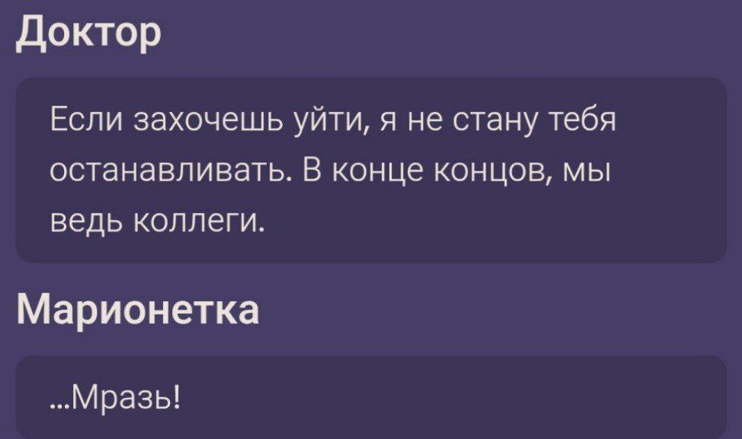 Так что вот, пока Доктор относительно неплохой персонаж, потому что есть чёткая мотивация в виде познания, экспериментам на грани одержимости. Это уже достаточно прописанный персонаж, которому нет смысла прикручивать что-то вроде "он хотел спасти мир от большего зла", текущие мотивы уже достаточно убедительные.