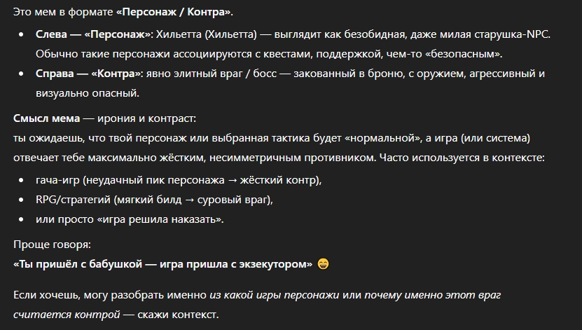 >>6195993 Этот нейро-текст меня ещё сильнее запутал. Но ведь бабка то не слабая, она легенда и даёт суровых пиздячек. А вот фатуец - обычный легкий моб, которых пачками крошим... Ничё не понял. Да и при чём тут начитанность тогда? Тут даже Достоевский был бы куда более уместен в этом меме, хотя тоже глупость.