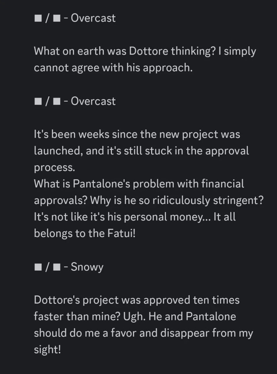 Чё они с Докторм сделали, я вообще не понял, если честно. Вся инфа в игре о нём и так специально подавалась в формате интерпретации, без конкретики, но при этом все вокруг продолжали говорить, что он мудак, даже если речь шла о молодом Зандике, который нихуя не успел сделать, и даже если об этом говорил кот-пиздабол. Я думал, что есть два варианта: либо Ляо что-то готовит и тут замешана судьба, как у Дурина, по которой Доктор обязан был родиться чудовищем и что бы он ни делал, окружающие будут его там воспринимать, и тот же мета нарратив бы передался игроам; либо Ляо просто пишет злого злодея без нюансов, а интерпретацию оставляет из-за лени, а не по задумке. Я был готов к обоим вариантам. И я нихуя не понял, что я в итоге увидел. Потому что чуваку опять накинули кучу полунамёков на мотивы, предысторию, чувства, в конце концов, включая его братскую привязанность к Колумбине, как бы снова намекнув, что он банально ненормальный и не понимает, что такое настоящая семья, но ему всё ещё как минимум жаль, что он не смог быть нормальным. Но в то же время он ведёт себя в смежных же диалогах как злодей с закрученными усами и творит лютую хуйню, а диалоги с ГГ выглядят как диалог антагониста из сейнена с протагом сёнена. В итоге персонаж совершенно непонятный вышел, ни туда, ни сюда. И совсем злым не получился, и в то же время неоднозначным его не назвать, ибо намёки такие жиденькие, что гадай, специально они там или нейронка сбоила. И это главный злодей региона. Сплошное разочарование. Могли бы его ещё в Сумеру ёбнуть и ничего бы не изменилось по итогу.