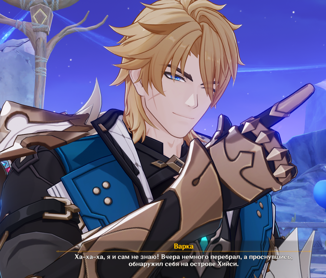 Вот без шуток, но пока что мне Варка напоминает, ебать его, Аратакки Итто! Только чуть более серьёзный и ответственный, но и то из-за обострённого чувства справедливости и звание Магистра. Будь он простым алкашом город Мондштадт - то точно также балагурил, бухал, пытался всем доказать, что самый сильный и доябывал бы прохожих на счёт лошадиных боёв.