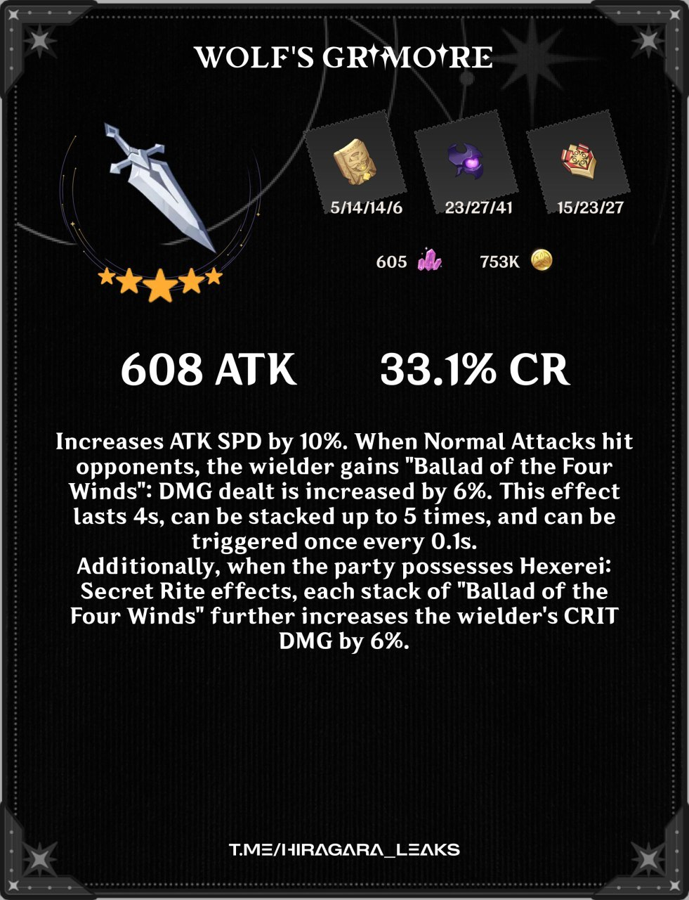 ・Кроме того, если у группы есть эффекты «Хексерей: Секретный Ритуал», каждый стак «Баллады о Четырех Ветрах» дополнительно увеличивает критический урон владельца на 6%.