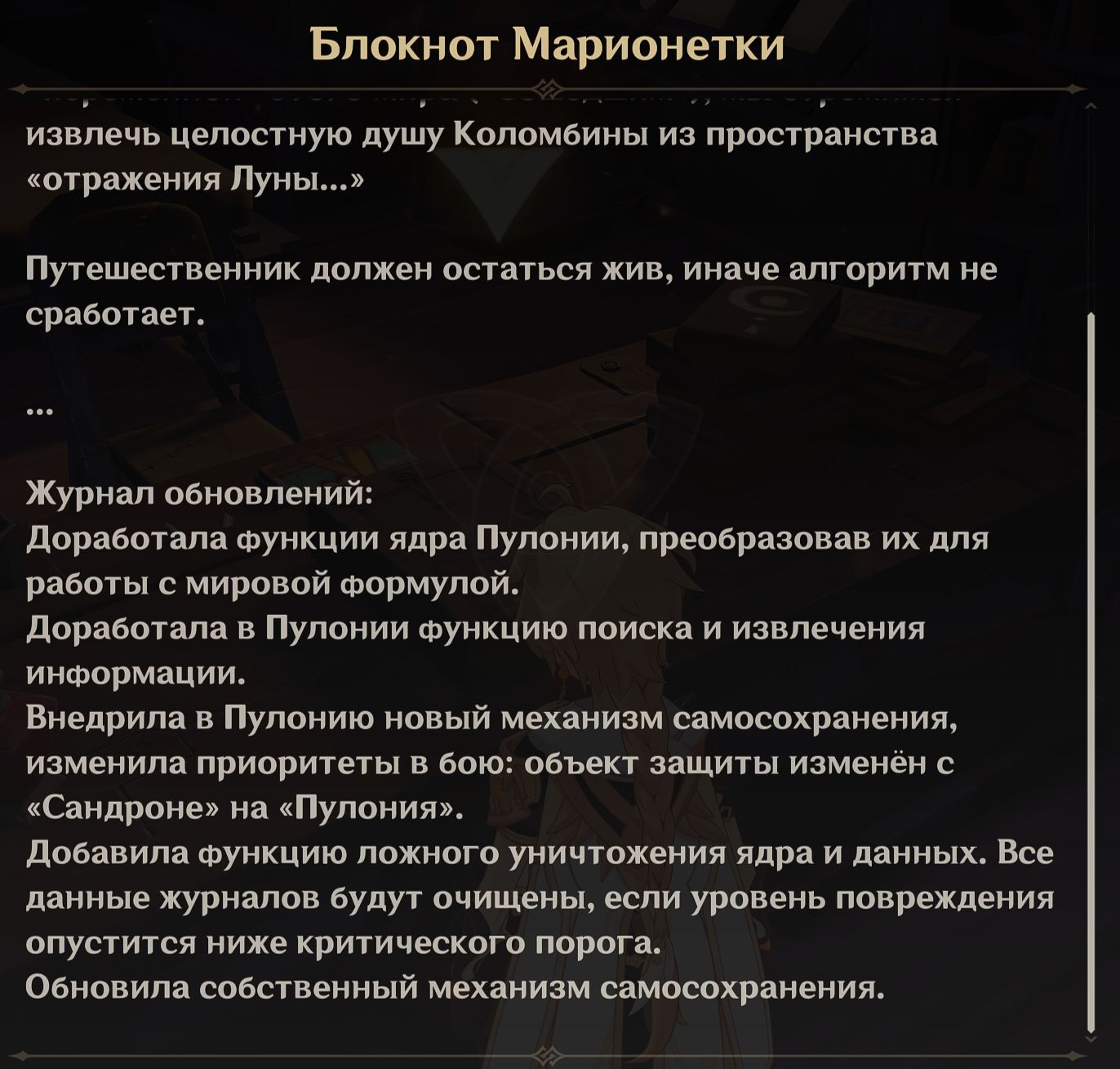 У меня по сюжету всего пара вопросов. Нахуя сделали бессмысленное самопожертвование Сандроне - оно выглядит слишком потужным, можно было и без него легко обойтись. Нахуя Варка отправился в экспедицию. Его заруба с Рери и доктором была ситуативной на месте, в чем причина его прихода в Нод-край вообще? Почему те же тени нихуя не сделали Дотторе? Единственное оправдание - ждали смогут ли смертные сами разобраться с проблемой, как поясняла Ронова в калтане. Что теперь с Колумбиной. У неё теперь автоторити как у четырёх теней/доктора за счёт силы трёх лун. Просто теперь все дальнейшие проблемы она может попячить, только если не вмещается сила извне типа бездны.