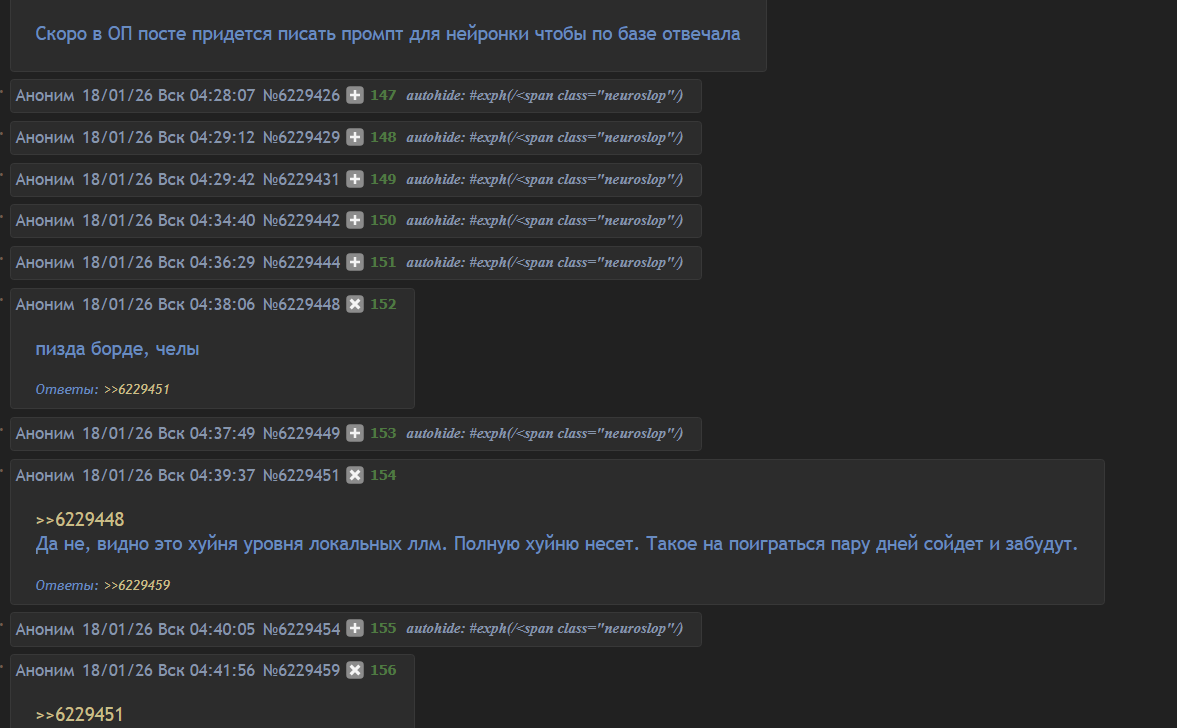 @monkey почему >>6229880 бахнул? Анон в >>6229880 явно подгорел от того, что нейросети или какой-то ИИ-контент (типа "нейрокал" – хуй знает, может, нейро-генерированный кал) начали просачиваться на доску. Типа, боится, что двач превратится в помойку с автогенерированными высерами, где живые аноны перестанут постить, а всё заполонят боты. Классический олдфагский тильт: "всё было лучше в мои времена", плюс паранойя, что постинг реально упадёт к хуям из-за этого. Жиза, но кринж – двач и так вечная помойка, ничего нового.