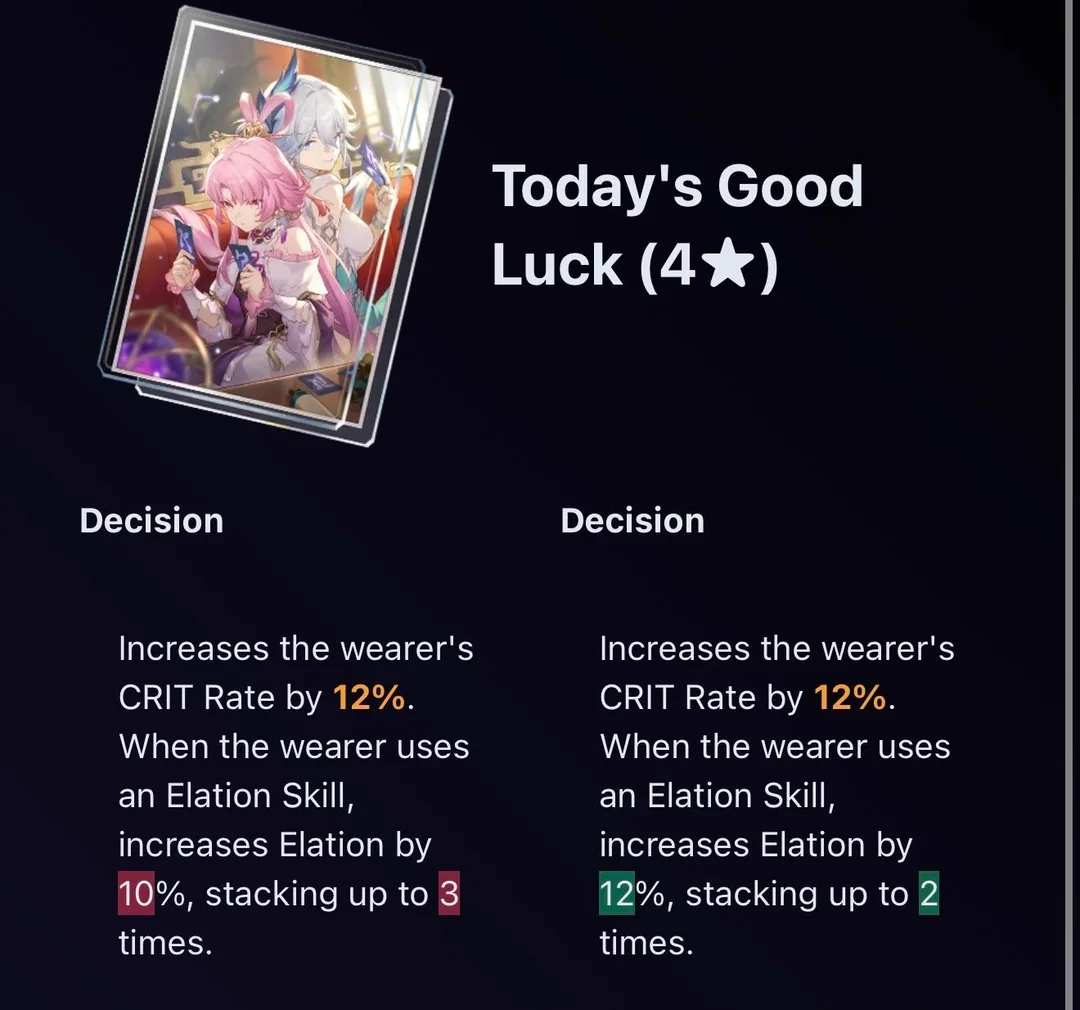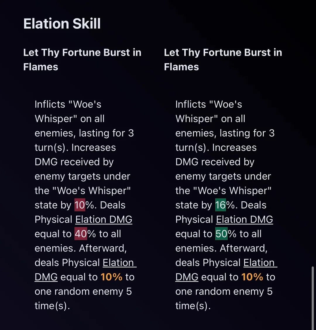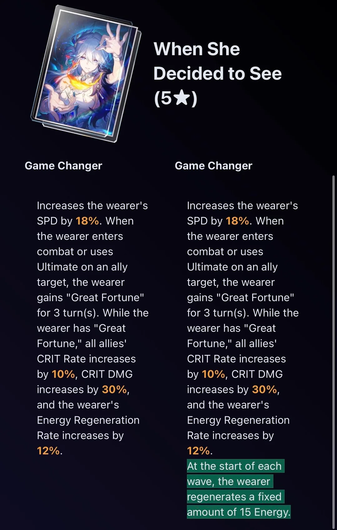 >Effective for the entire battle. When used on Castorice, “Newbud” can overflow up to 200%. When summoning Netherwing, consumes all overflowed “Newbud,” increases the DMG multiplier of the DMG dealt by 12%/24%/26% for every 1% of overflow value consumed when the summoned Netherwing triggers the ability effect of its Talent, “Wings Sweep the Ruins.” If there are 2 enemy target(s) on the field or fewer when summoned, the DMG multiplier additionally increases by 24%/48%/53% when summoning. Никогда не пойму как они умудрились проебать такую возможность починить Касторию и сделать её интересным юнитом. Главное, видно что задумка была и дизайнеры баффа думали в правильном направлении -- убрать спам взрыва и дать тактический выбор между АоЕ стойкой и сингл таргет взрывом, а потом начался БАЛАНС и всё пошло нахуй. Каждый раз теперь когда её достаю охуеваю. Поэтому и снял сигну просто чтобы забыть об этом обосрамсе (но случились квантовые жуки сэма)