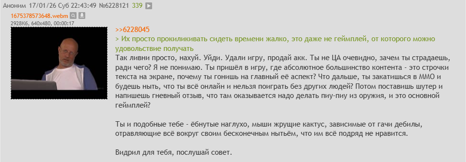>>6228045 > Их просто прокиликивать сидеть времени жалко, это даже не геймплей, от которого можно удовольствие получать Так ливни просто, нахуй. Уйди. Удали игру, продай акк. Ты не ЦА очевидно, зачем ты страдаешь, ради чего? Я не понимаю. Ты пришёл в игру, где абсолютное большинство контента - это строчки текста на экране, почему ты гонишь на главный её аспект? Что дальше, ты закатишься в ММО и будешь ныть, что ты всё онлайн и нельзя поиграть без других людей? Потом поставишь шутер и напишешь гневный отзыв, что там оказывается надо делать пиу-пиу из оружия, и это основной геймплей?