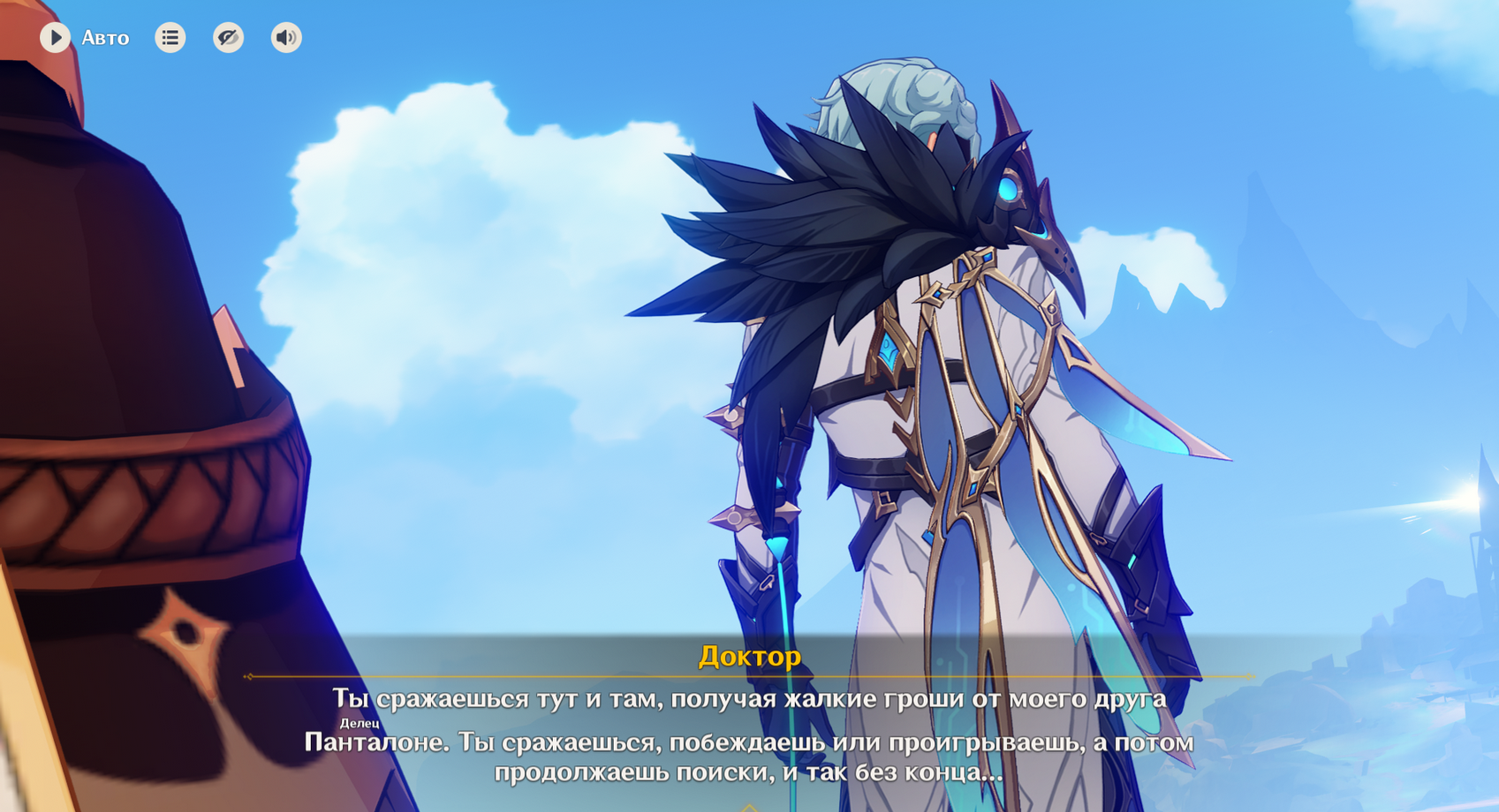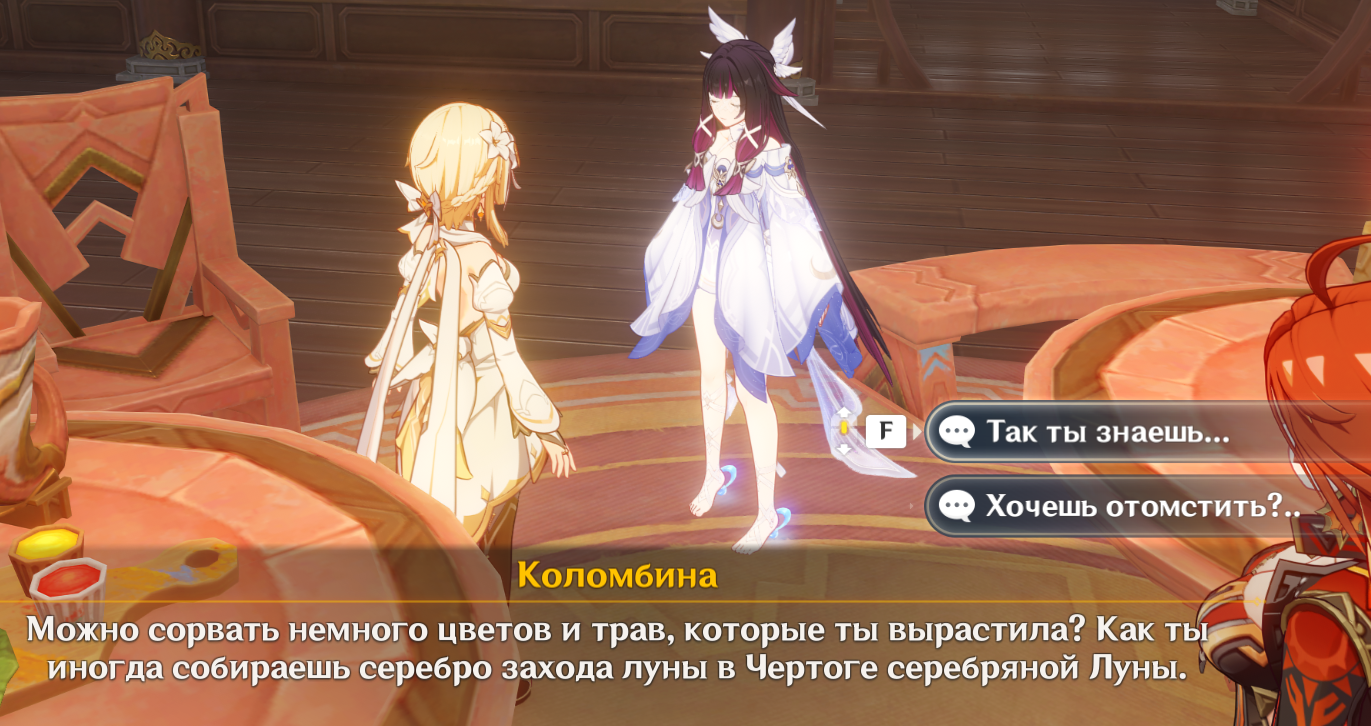 Кстати из-за того что китайцы заблочили мне последнюю встречу в пещере, перед отправкой на Луну, я обратил внимание что озвучка англ. Коломбины действительно хороша. На контрасте с уже вполне активной Клумбой в конце сюжета, по голосу чувствуется что перед исчезновением она почти помирает, но боится сказать об этом, и в итоге выдаёт первое пришедшее в голову желание - мол в таверне хочу попробовать что-нибудь.