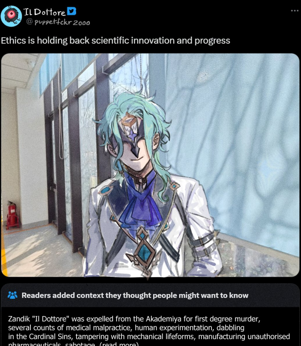 >>6232224 > что угодно Но такое раньше только с ним было. > А она есть? Она кусками разбросана по рандомным запискам в Сумеру уже как 3 года и там дохуя белых пятен, которые Ляо будто специально оставил не раскрытыми. Опять же, Ляо по какой-то причине напрямую не подтвердил, что Доктор = Зандик, хотя раньше всегда это делал. > Было в Сумеру. При первом появлении оно у всех есть. Ты вообще не читал, что я писал, да? Проблема именно в представлении босса. > его уже Царица разрешила вайпнуть У Кучи в Сумеру оно было, хотя он покинул Фатуи ещё в Инадзуме. У Доктора даже имя расположено неправильно. У всех оно всегда в кольце рядом с титулом. Не только у Фатуи, но и у Ведьм с Грешниками так было. А у Дока титул и имя по разные стороны экрана. Ты как бы понимать должен, что Ляо же не просто на похуй технические моменты делает, типа таких, это дополнительные усилия, они должны иметь какой-то смысл, если он резко меняет отработанный паттерн. Вон у Алисы и Николь было нормальное представление в прошлом патче буквально, а тут чё-то съехало всё. > каждый проговорить должен Когда Синьора сдохла, это подтверждали несколько источников, включая Михаила с Людмилой. А тут Куча, который всегда несёт хуйню про других и ошибается по кд. И даже тут Куча чувствует, что что-то не так. > Все еще имеет возможность сказать Не, так то можно. Но нахуя он полтора года назад уже во время Калтейна на интервью подтвердил, что это будущее событие. > Дотторе в типичного босса недели Так речь не о том, чтобы сделать его повторяющимся злодеем. Опять же, не первый случай был бы, когда мы дважды между версиями сражались с одним и тем же персонажем. Щёкун в 2.0, 2.1 и кукла её же в 2.5 не дадут соврать. Его есть, куда развивать, плюс его линии с некоторыми персонажами, особенно с Кучей, не закончены и ощущаются пустыми сейчас, их надо закрыть как минимум чем-то нормальным.