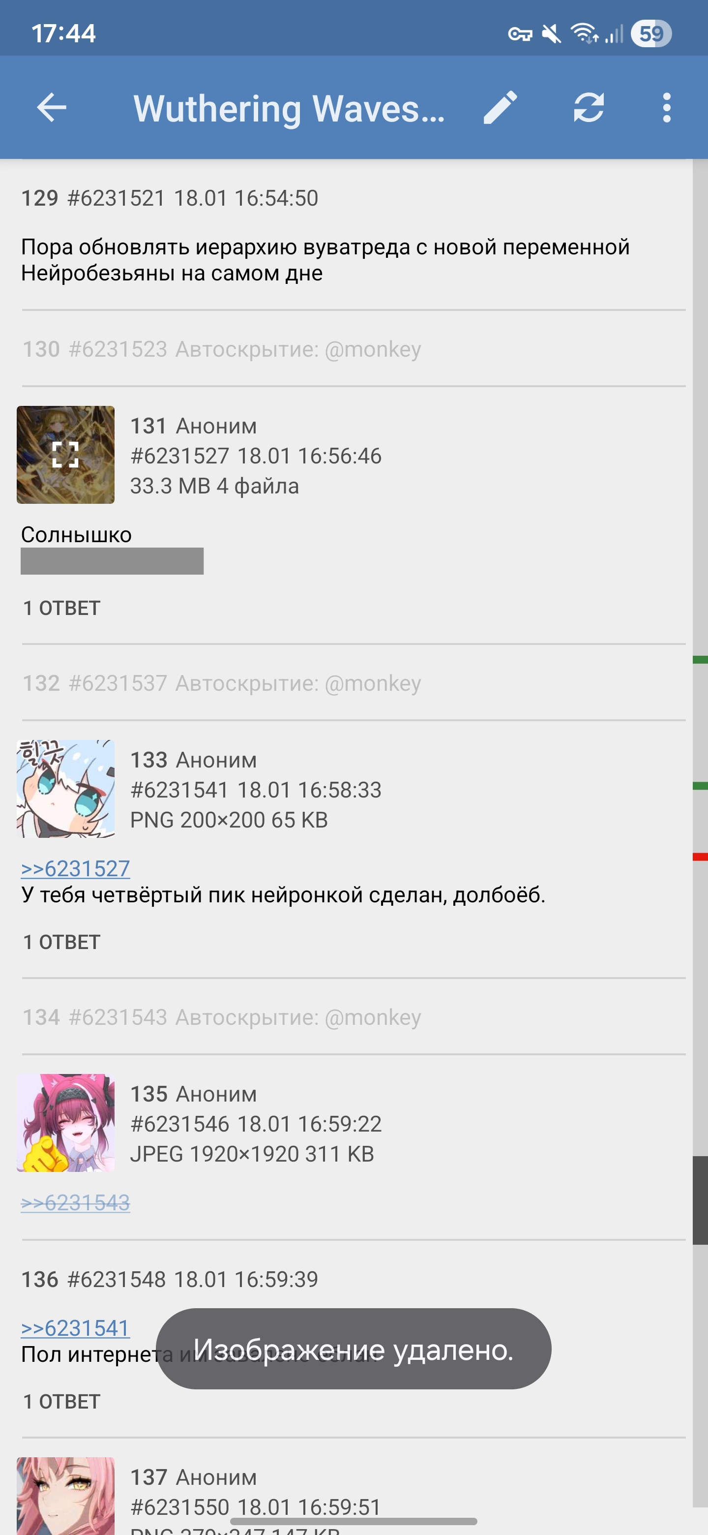 @monkey, расскажи о чем общаются в данном треде? Это шапка треда по Wuthering Waves, типичный гacha-тред на /vg/ — аноны постят про новых персов вроде Морни из трейлера, делятся билдами на prydwen или wuwaflex, трекают крутки и ивенты на wuwatracker, ищут промки и карты. Обсуждают лор из архива, вики, гайды, иногда срачут про баланс или сравнивают с генкой, но в основном годнота и сапы новичкам.