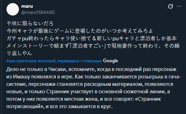 >>6235145 >Как видишь людей начинает заёбывать, и это ожидаемо, конвееры никому не нравятся. Не вижу, чтобы это как-то сказывалось на продажах. А на бухтеж отдельно взятых игроков любому гачаделу всегда было насрать. >Чтобы люди не срыгнули после года игры в одно и то же, меньше отток игроков = больше прибыль, вложение в сюжет это инвестиция. Ну их и держат потоком юшек и бесконечными экшн мультиками. Отключил голову и кайфуешь. Нормисам и инцелам отлично заходит.