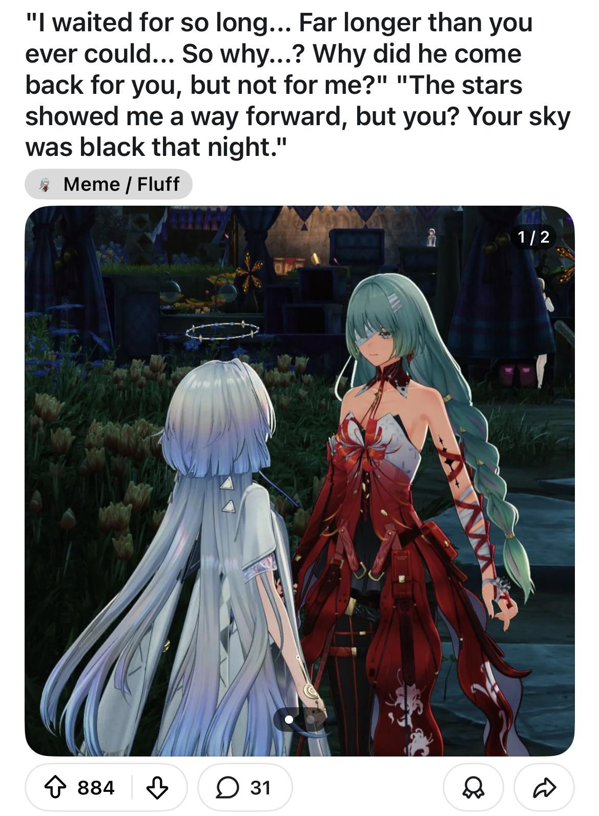 >>6236077 >Единственное, что сейчас отдаляет персонажей от альтеров - их популярность. Повод для возвращения придумать можно всегда и завернуть его можно по-разному. Было бы желание. Лол. Главное, что определяет присутствие персонажа в сюжете - это баннер. Заходят выдоить лохов на реране - добавят камео.
