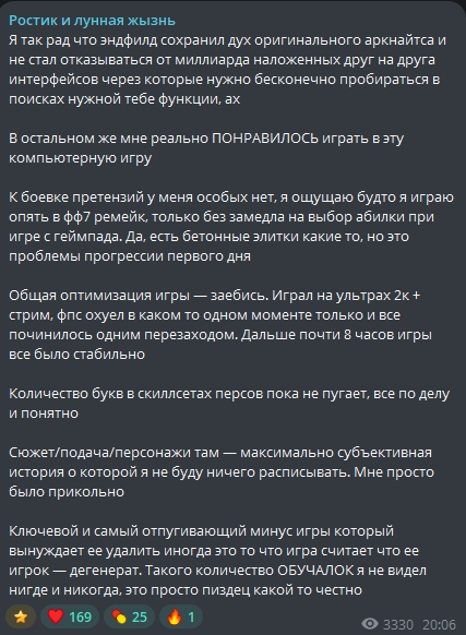 Как хорошо в отпуске, можно проебать 15 часов до головной боли в игре, ухбля. Самый главный минус - слишком много повторяющейся инфы в гайдах. Чисто для аутистов с едицей интеллекта как в фолаче. А так минусов не вижу.