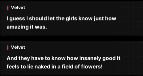 Ну не. Все-таки я ебал такие заигрывания с темой шлюховатости. Вел-то сасная, и я верю, что она девственница и бережет свой цветочек только для СКК, но, сука, слишком много вот такой вот хуйни на десять строчек текста.