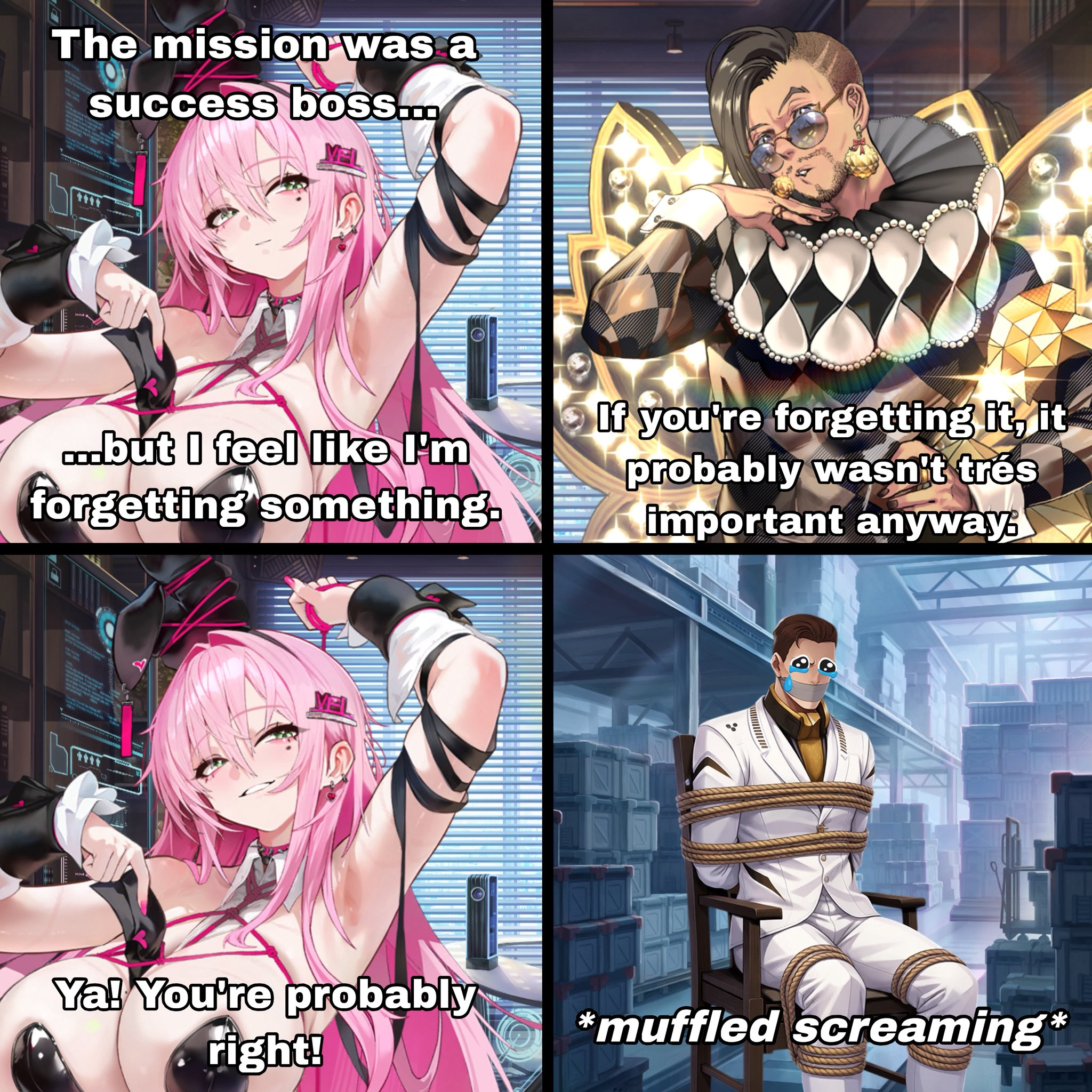 >>6288794 >Main Story Update Это мы любим >Story will try to connect everything together and delve into the past of CEOs, Oswald’s ‘untold tales’, and other ‘compelling narratives’. Ну бля надеюсь будет про мафиозника Мустанга и связь Ингрид и E.H., то, что Жиен анальный раб V.T.C уже поняли, может наконец Сикс0. >Raid Похуй, мы люди маленькие, 10-30 процентов набили и успокоились >Surface Content Ну тут похуй+база, гринд был скучнейший, а стимул закрывать боссов под угрозой нескольких дней реанимации отрядов отсутствовал, лучше бы чиби мод на постоянку подрубили в мейн игре >New Favorite Items will be released February Дайте бля чумоданов, у меня на зачистку таверов еле хватает - Хелм потому что мета и Драке с ивента, ещë Эксия по приколу. Ну иупо качать какую то мертвичину ноль желания.