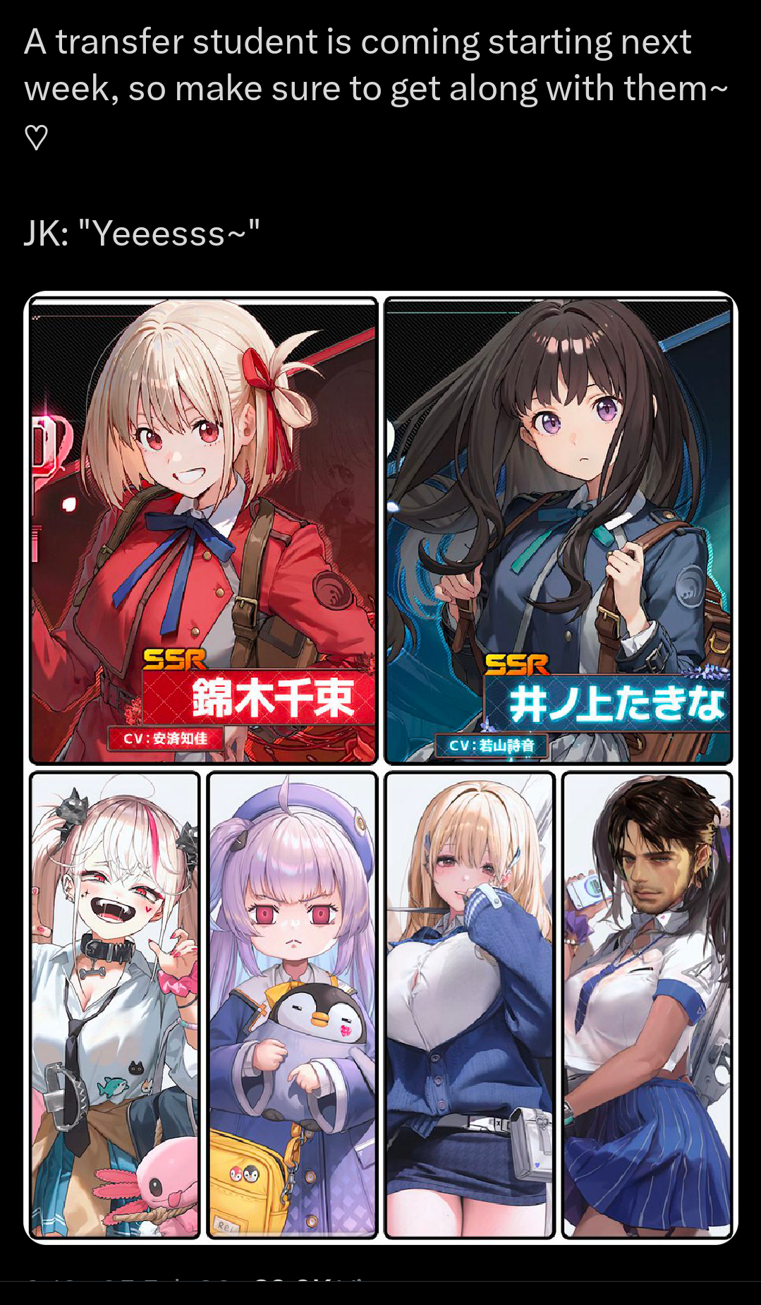 >>6300962 Сюжет и сеттинг каловое говно. НО всё остальное на топовом уровне: персонажи, их взаимодействия друг с другом, диалоги, анимации. Про Чисато и Такину можно сказать, что это хорошие персонажи, запертые в бездарном произведении. Теперь их временно запрут в другом бездарном произведении хехе
