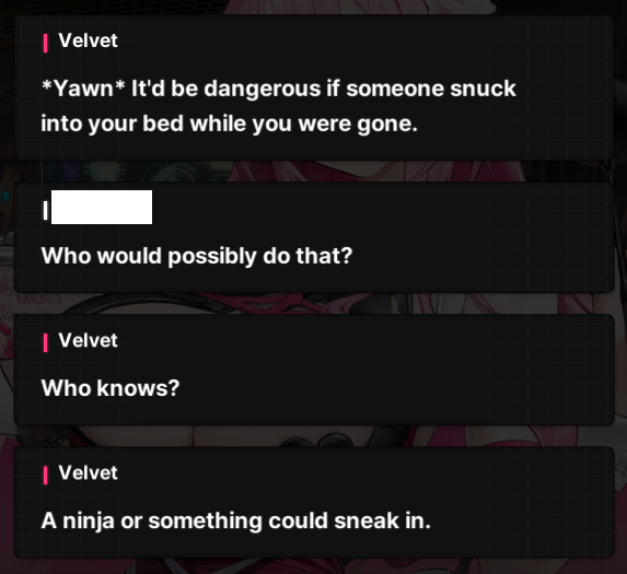 >>6307579 У Соды был "перерыв" в комнате отдыха с Командиром в конце бонда (что было в альте зайки я не помню, но скорее всего тоже секс). С Аде было свидание в Арке, максимум (в альте зайки был секс). С Кокоа мы сворачивали самолётики, преследовали D на платформе AZX и давали пиздюлей бандюкам. С Привати мейдой были обнимашки, максимум.