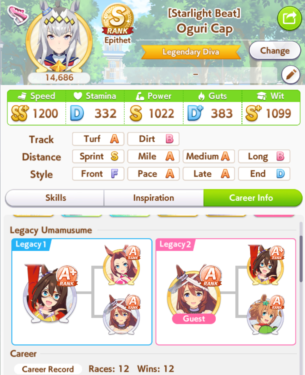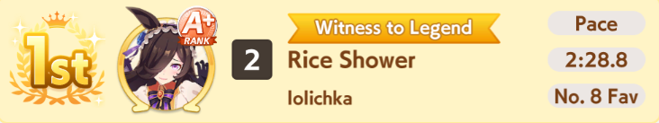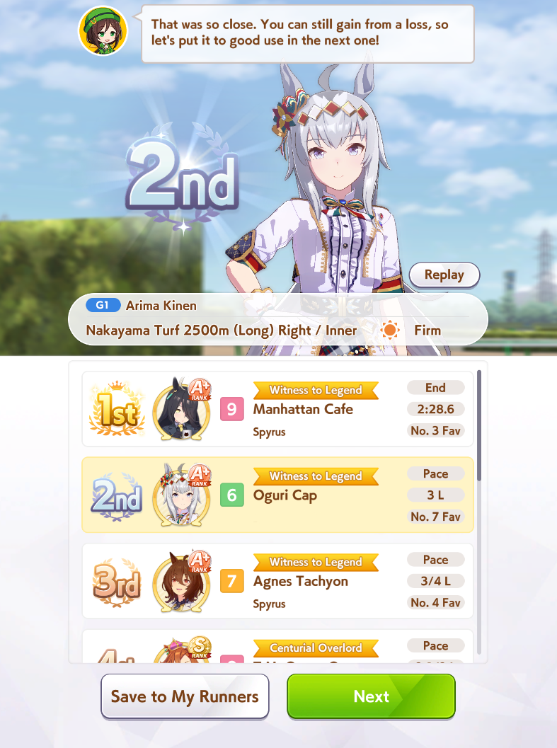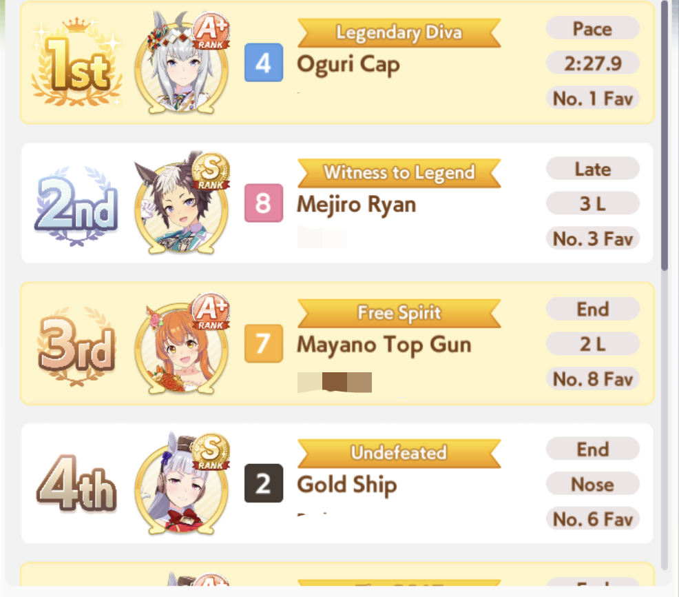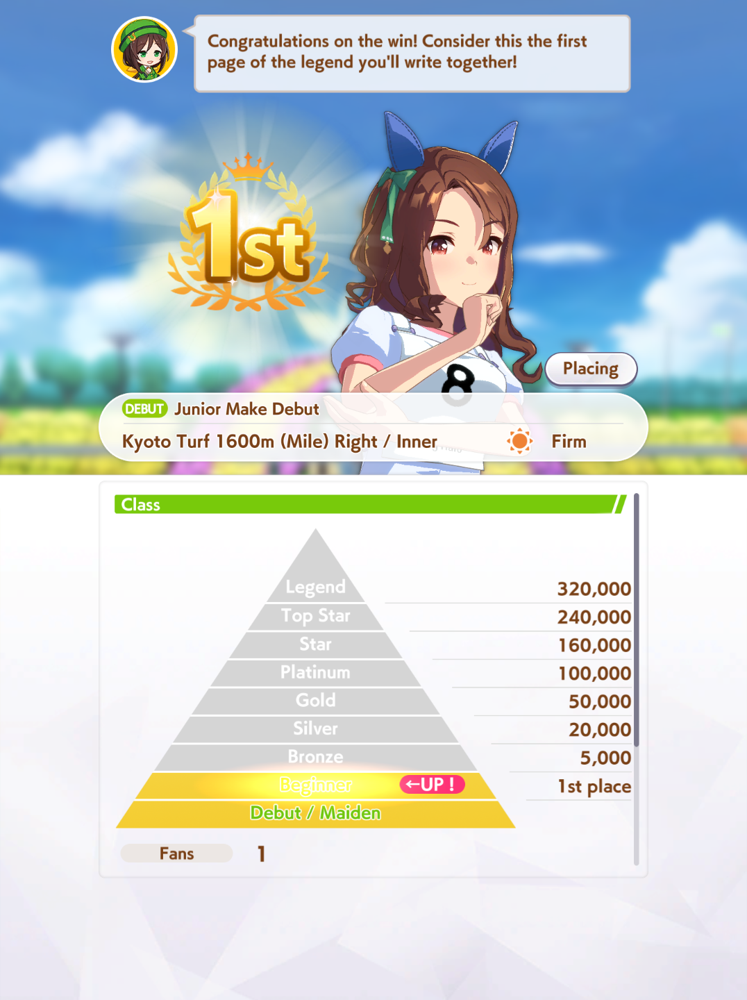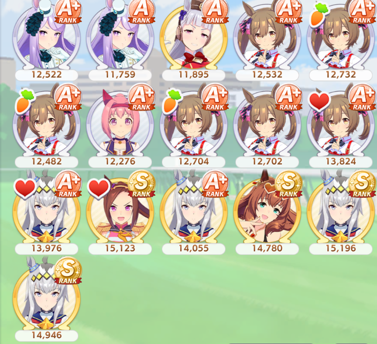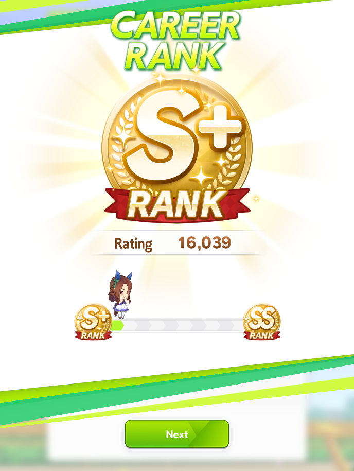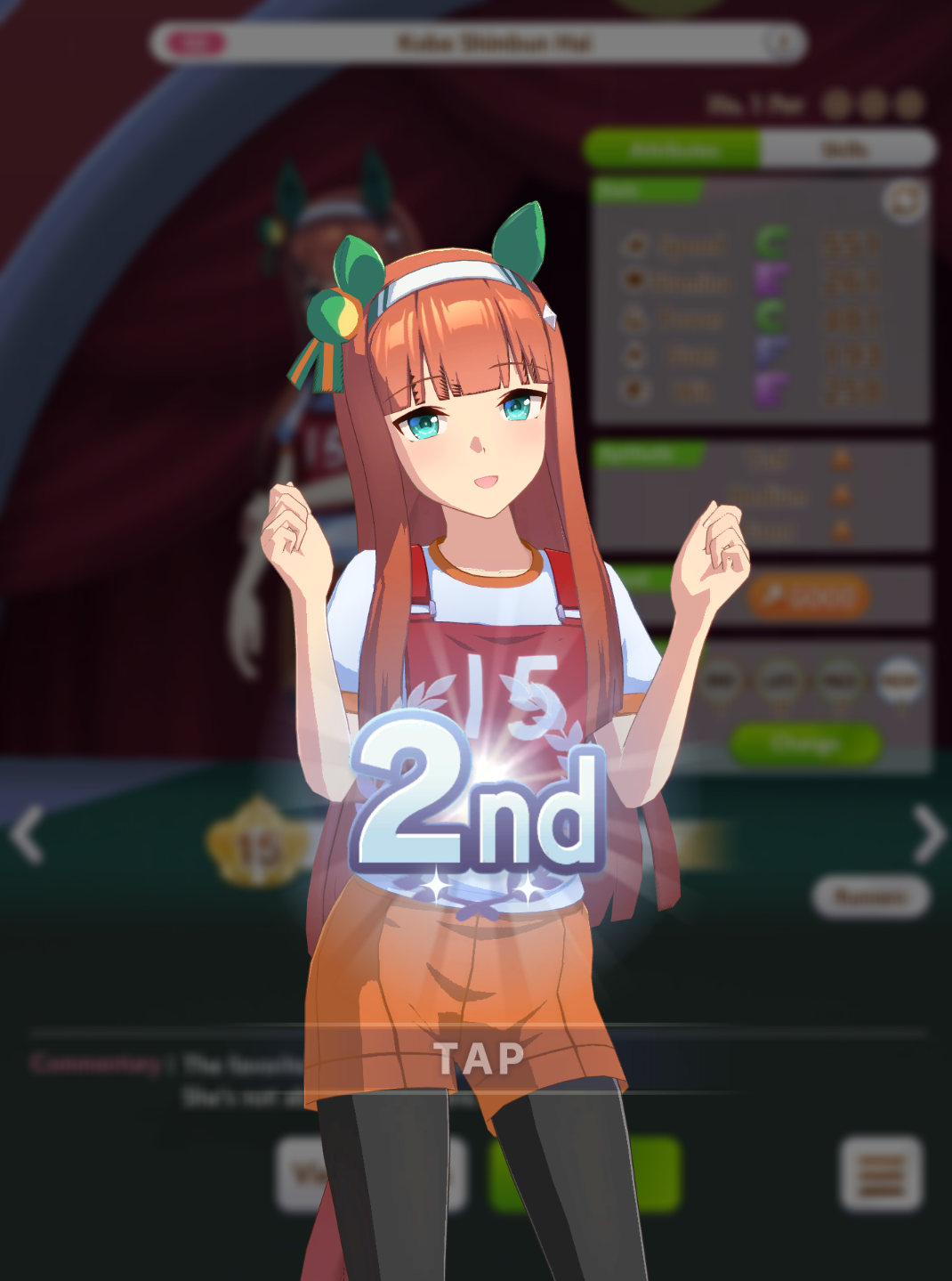 Первое впечатление от карьеры - лёгкая и чилловая. Не знаю как будет дальше, но даже несмотря на противное задание как у Огури а-ля: Выиграй в топ 3 столько то гонок, что принуждает тебя тратить ходы она и Юнити выиграла А ранговой тимой и сама вырывалась вперёд всегда под конец. Ума стан и S не упали и ладно, я и не думал что успею на этот турик её сделать