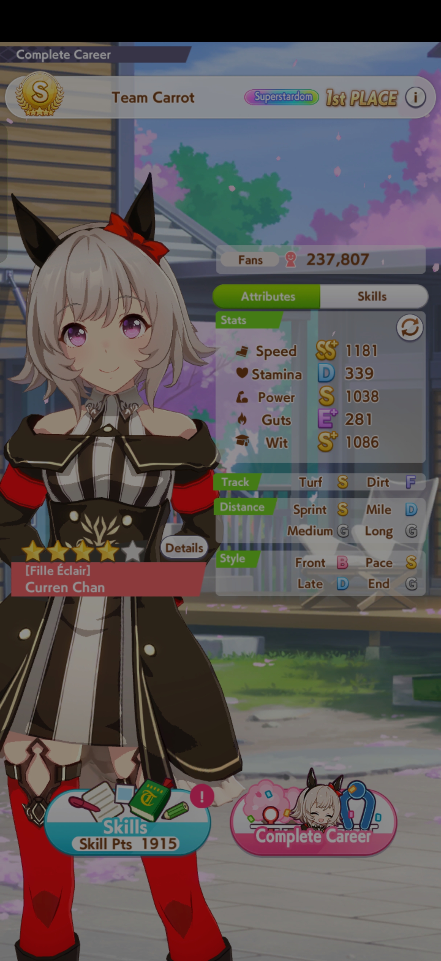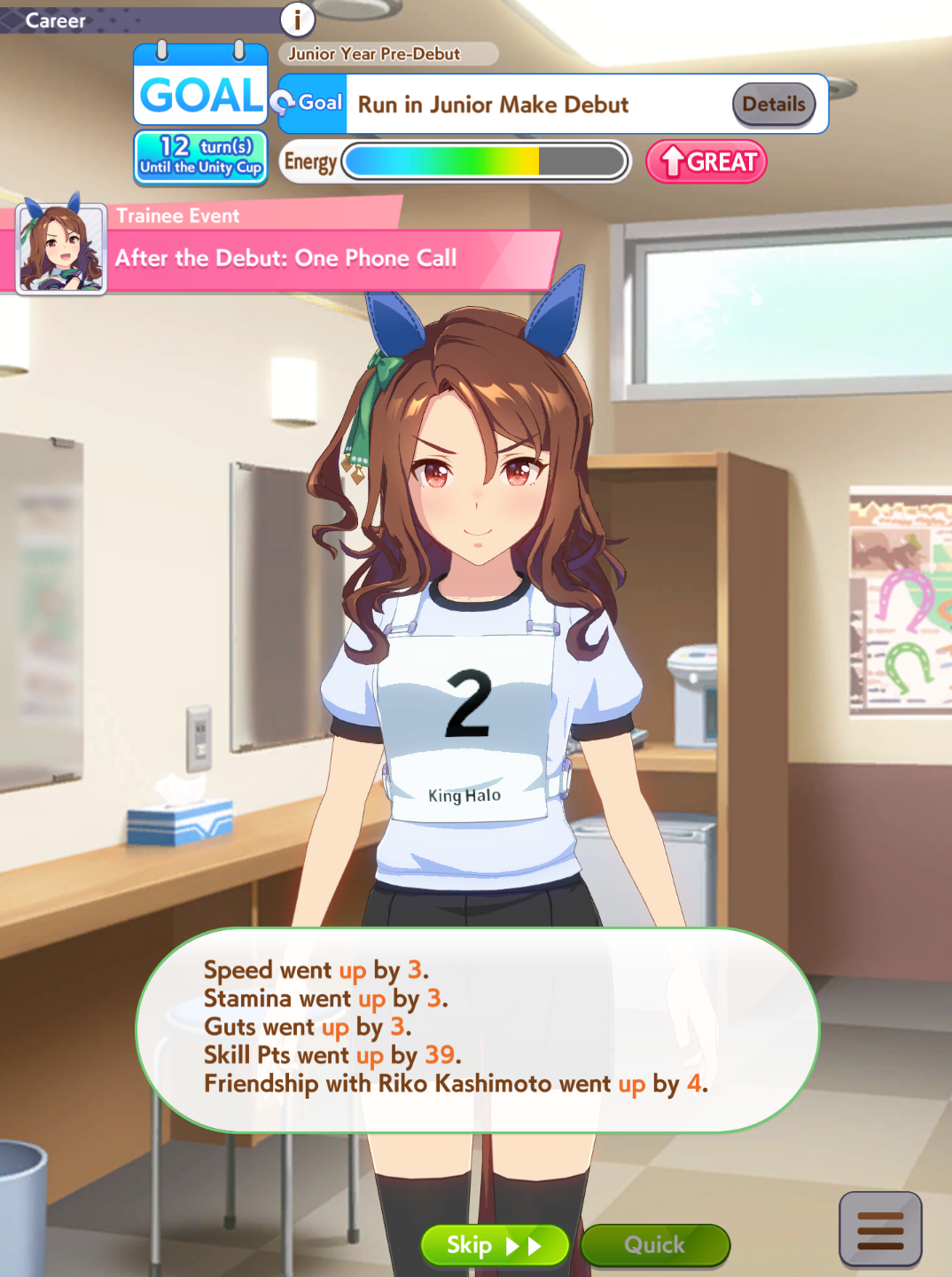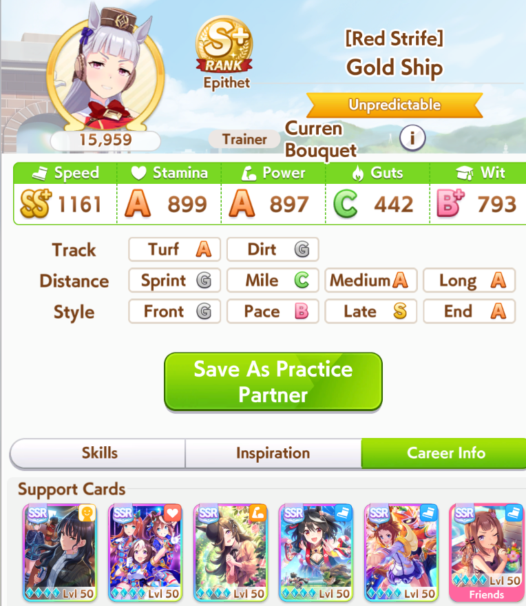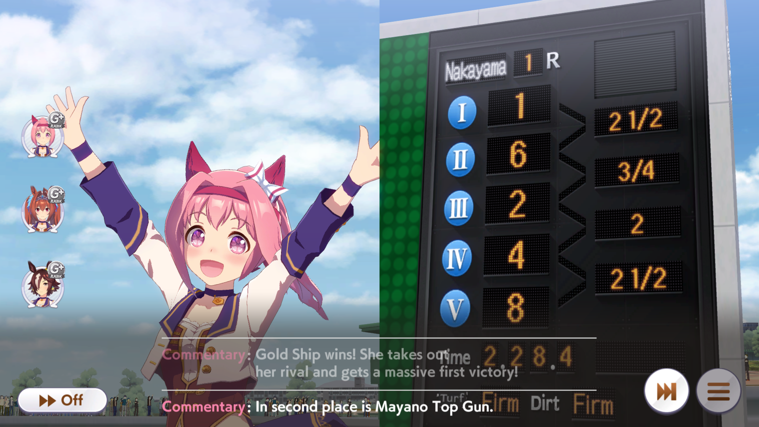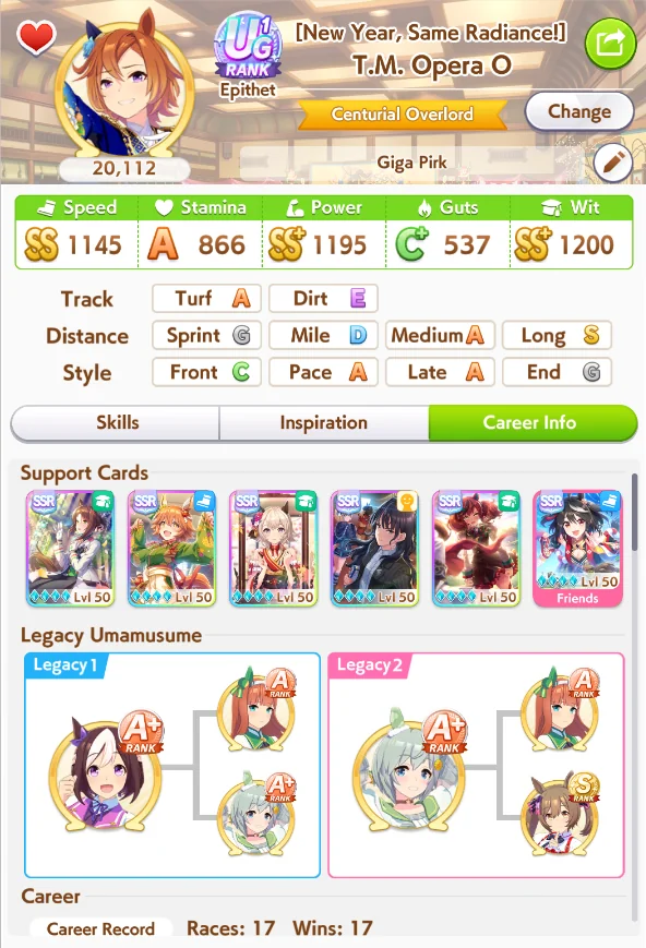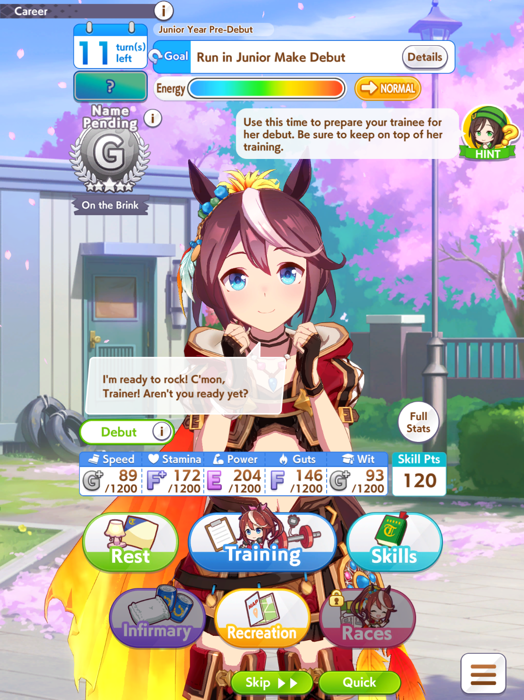 Первое впечатление от карьеры - лёгкая и чилловая. Не знаю как будет дальше, но даже несмотря на противное задание как у Огури а-ля: Выиграй в топ 3 столько то гонок, что принуждает тебя тратить ходы она и Юнити выиграла А ранговой тимой и сама вырывалась вперёд всегда под конец. Ума стан и S не упали и ладно, я и не думал что успею на этот турик её сделать