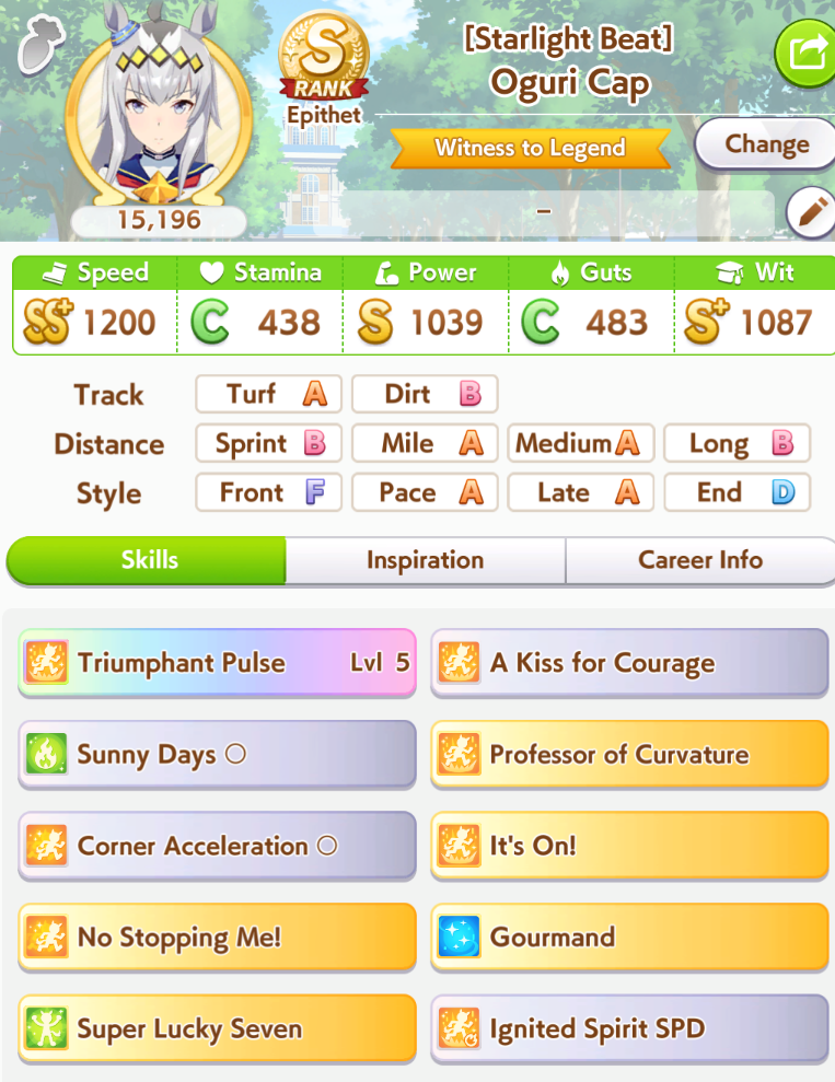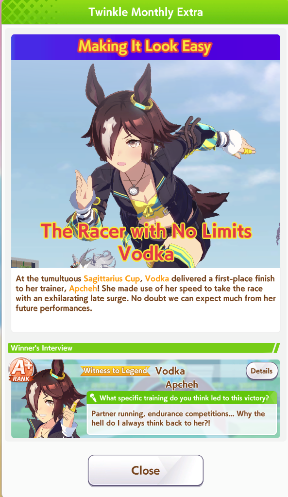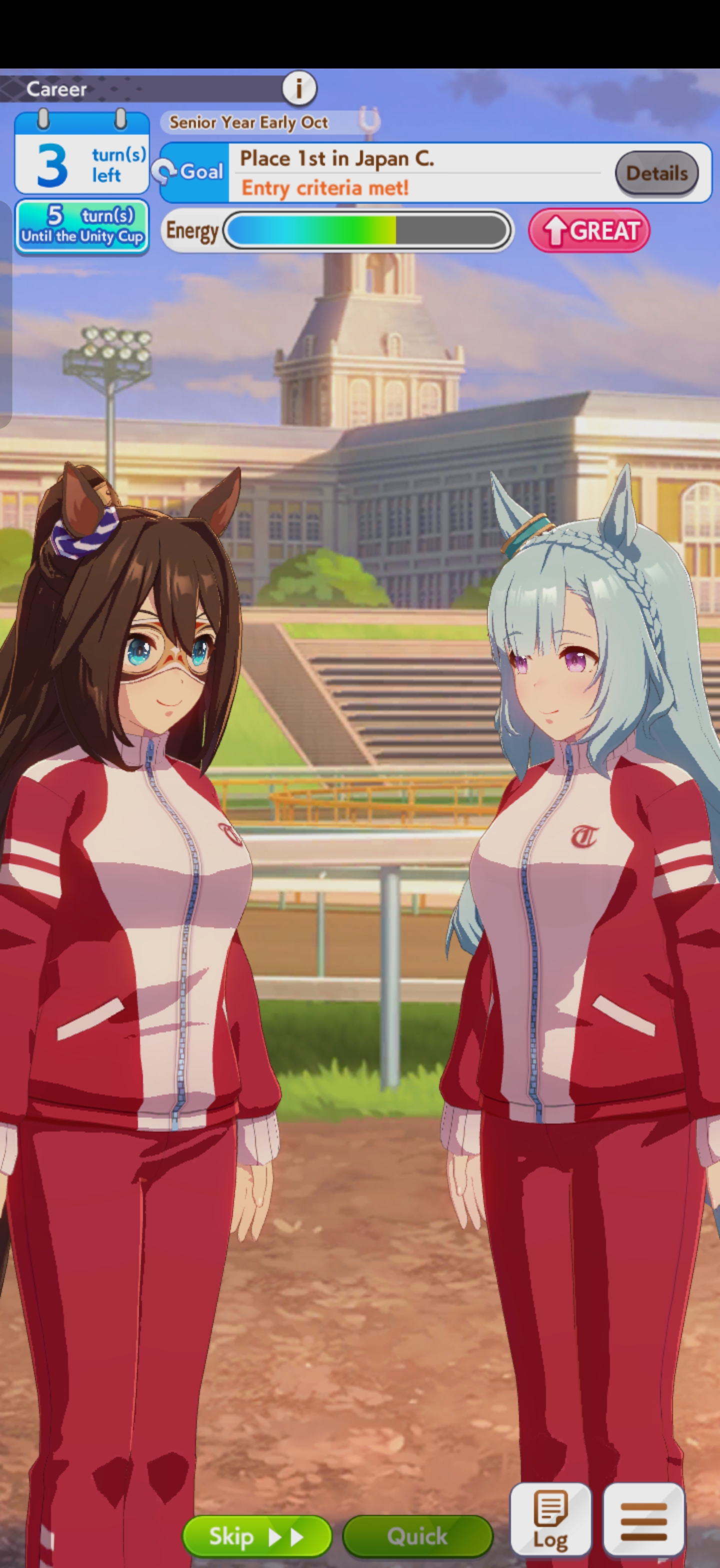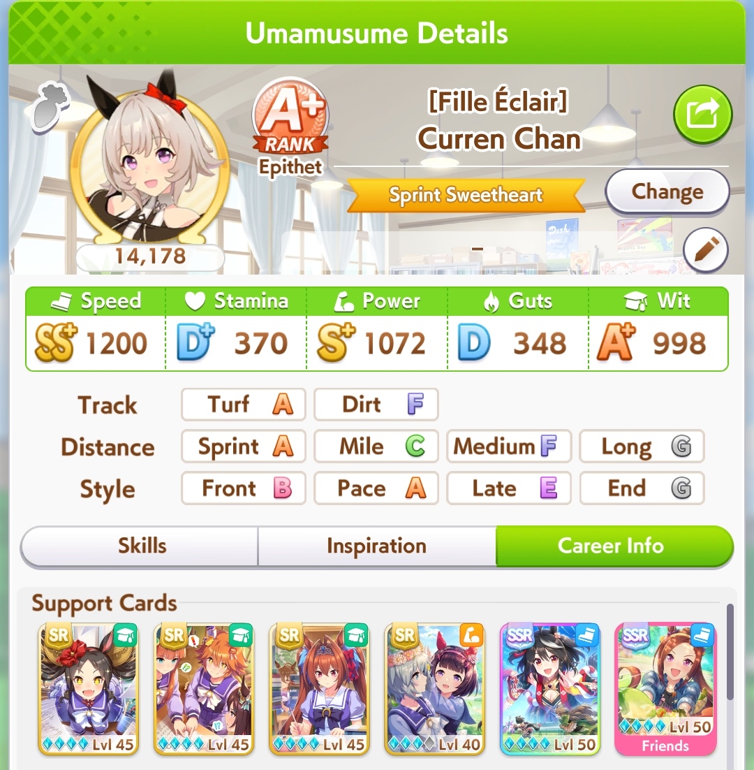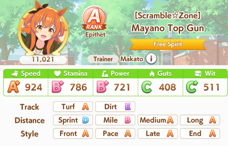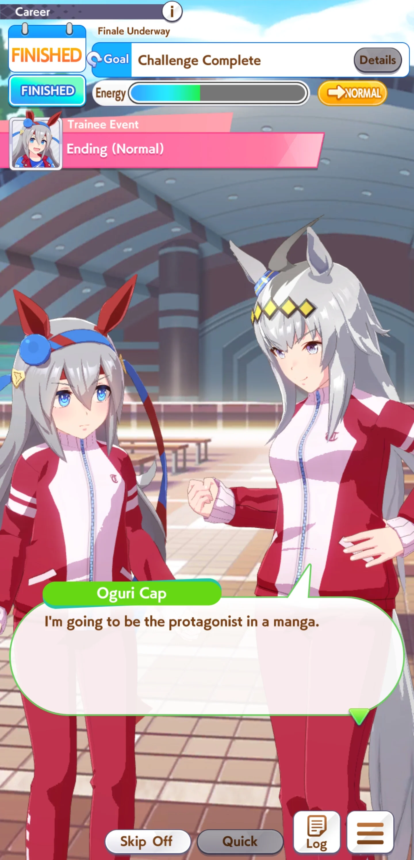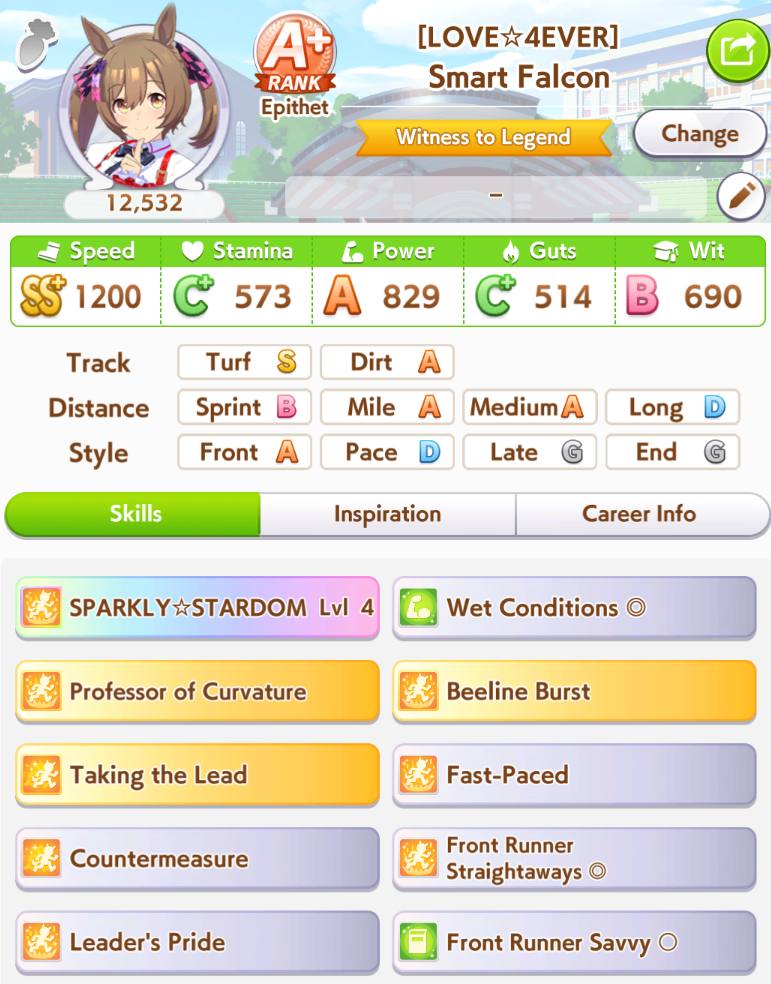 Первое впечатление от карьеры - лёгкая и чилловая. Не знаю как будет дальше, но даже несмотря на противное задание как у Огури а-ля: Выиграй в топ 3 столько то гонок, что принуждает тебя тратить ходы она и Юнити выиграла А ранговой тимой и сама вырывалась вперёд всегда под конец. Ума стан и S не упали и ладно, я и не думал что успею на этот турик её сделать