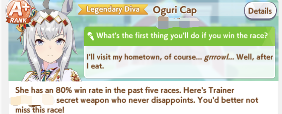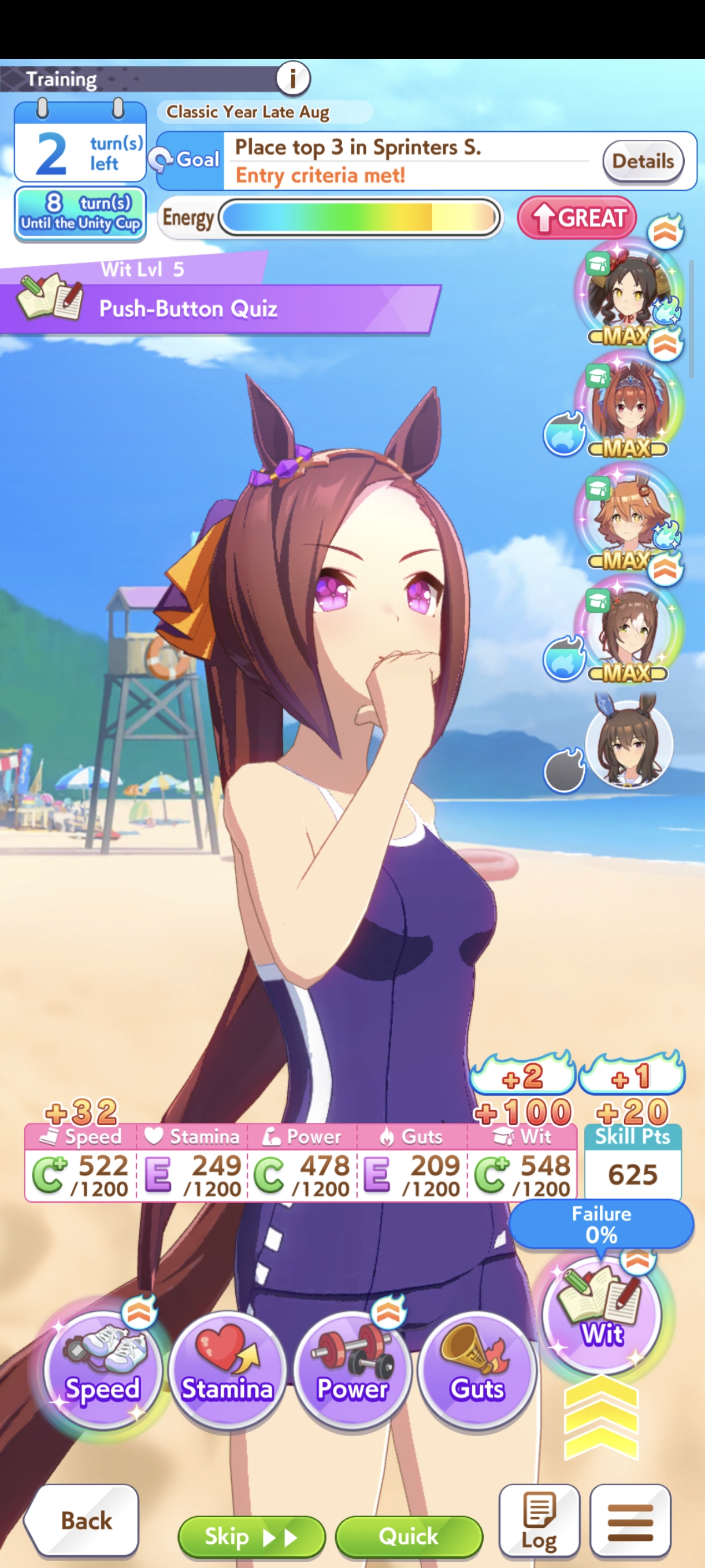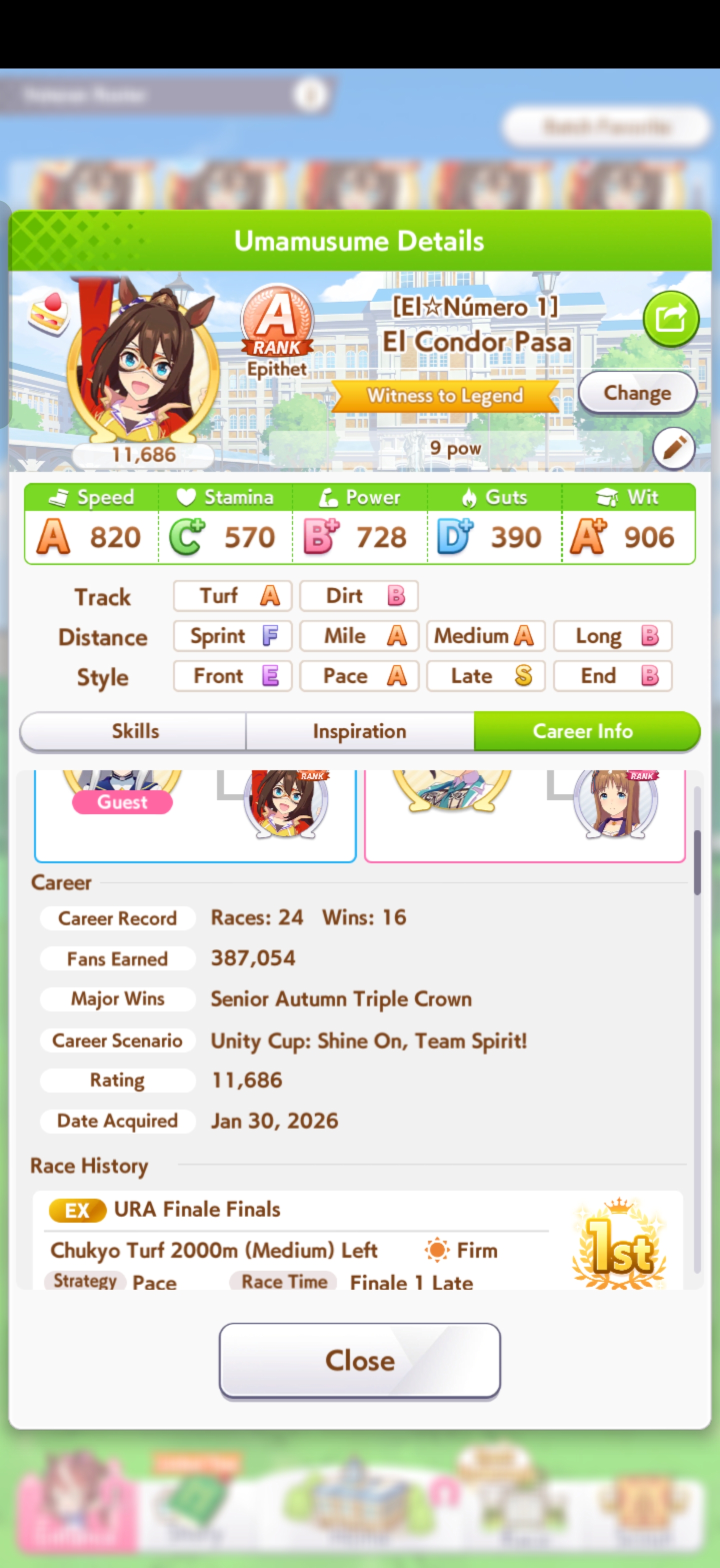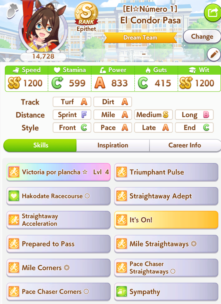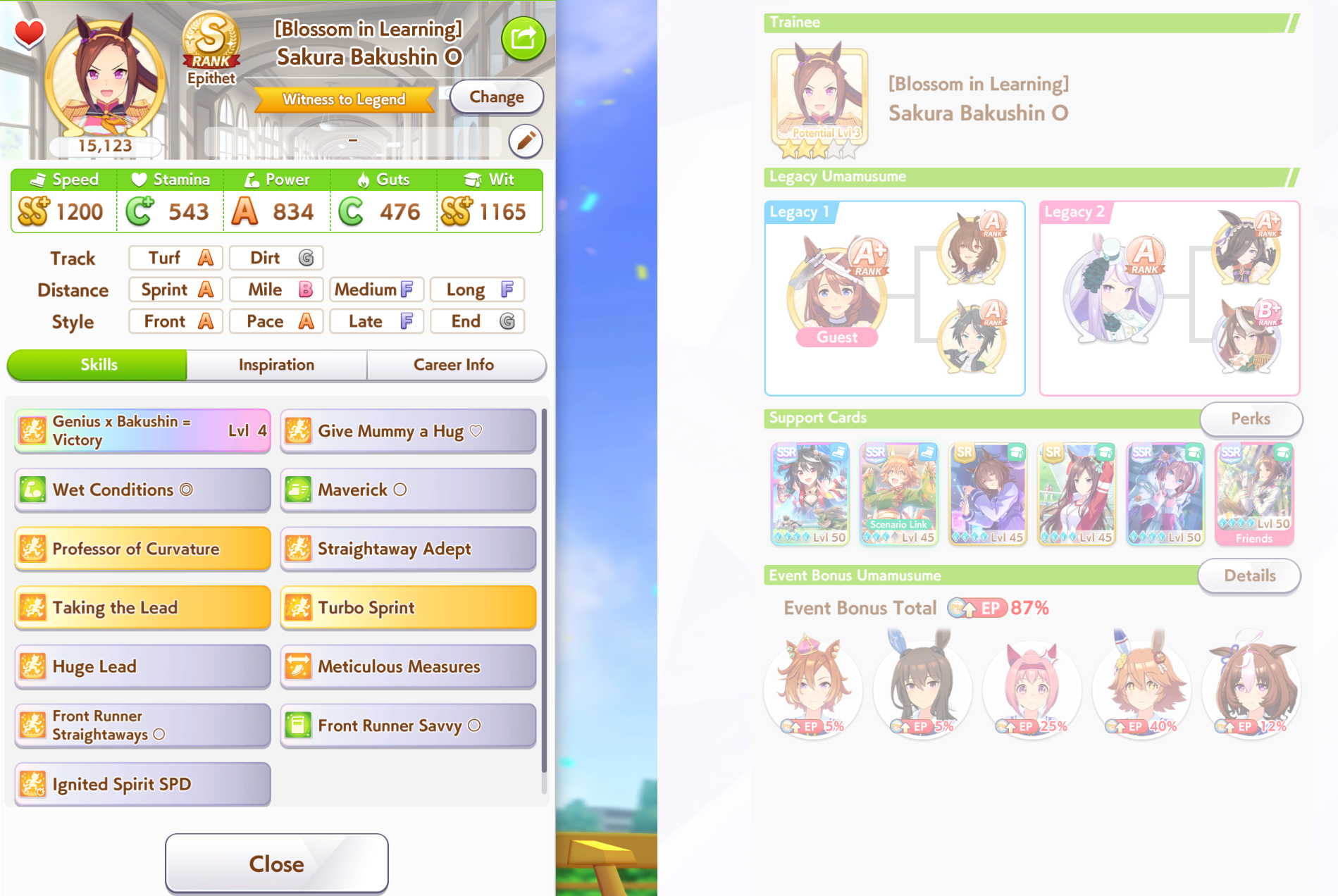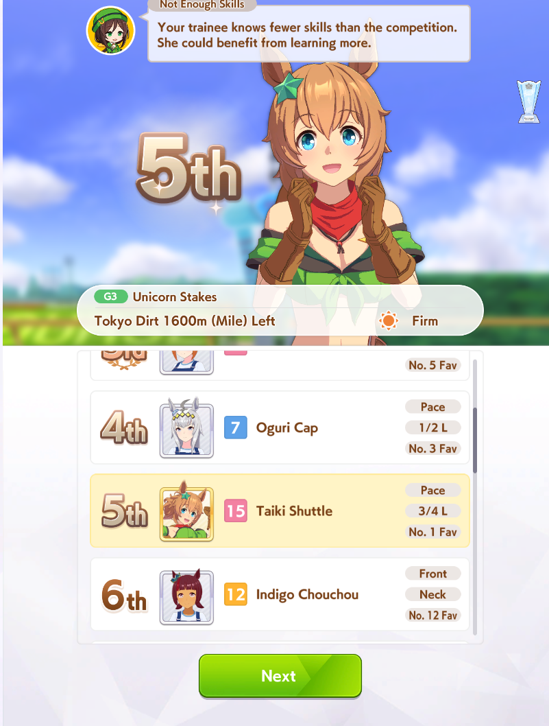 Первое впечатление от карьеры - лёгкая и чилловая. Не знаю как будет дальше, но даже несмотря на противное задание как у Огури а-ля: Выиграй в топ 3 столько то гонок, что принуждает тебя тратить ходы она и Юнити выиграла А ранговой тимой и сама вырывалась вперёд всегда под конец. Ума стан и S не упали и ладно, я и не думал что успею на этот турик её сделать