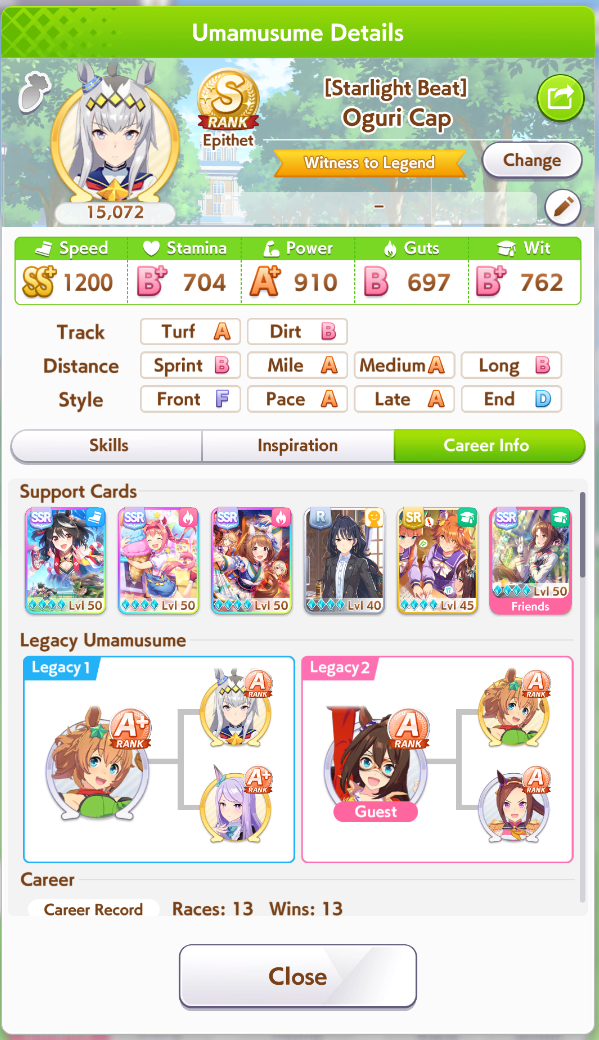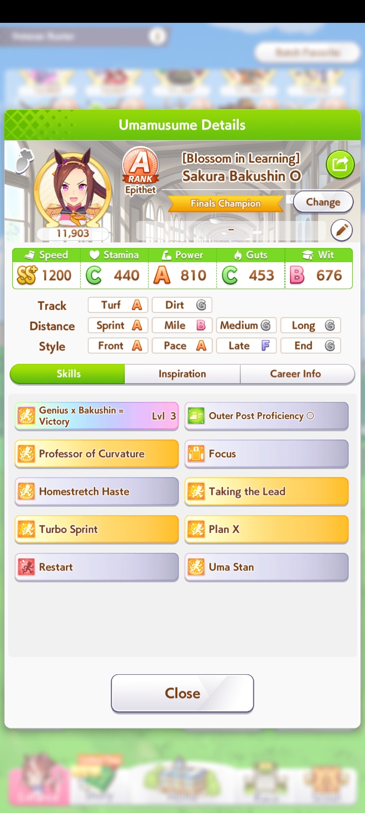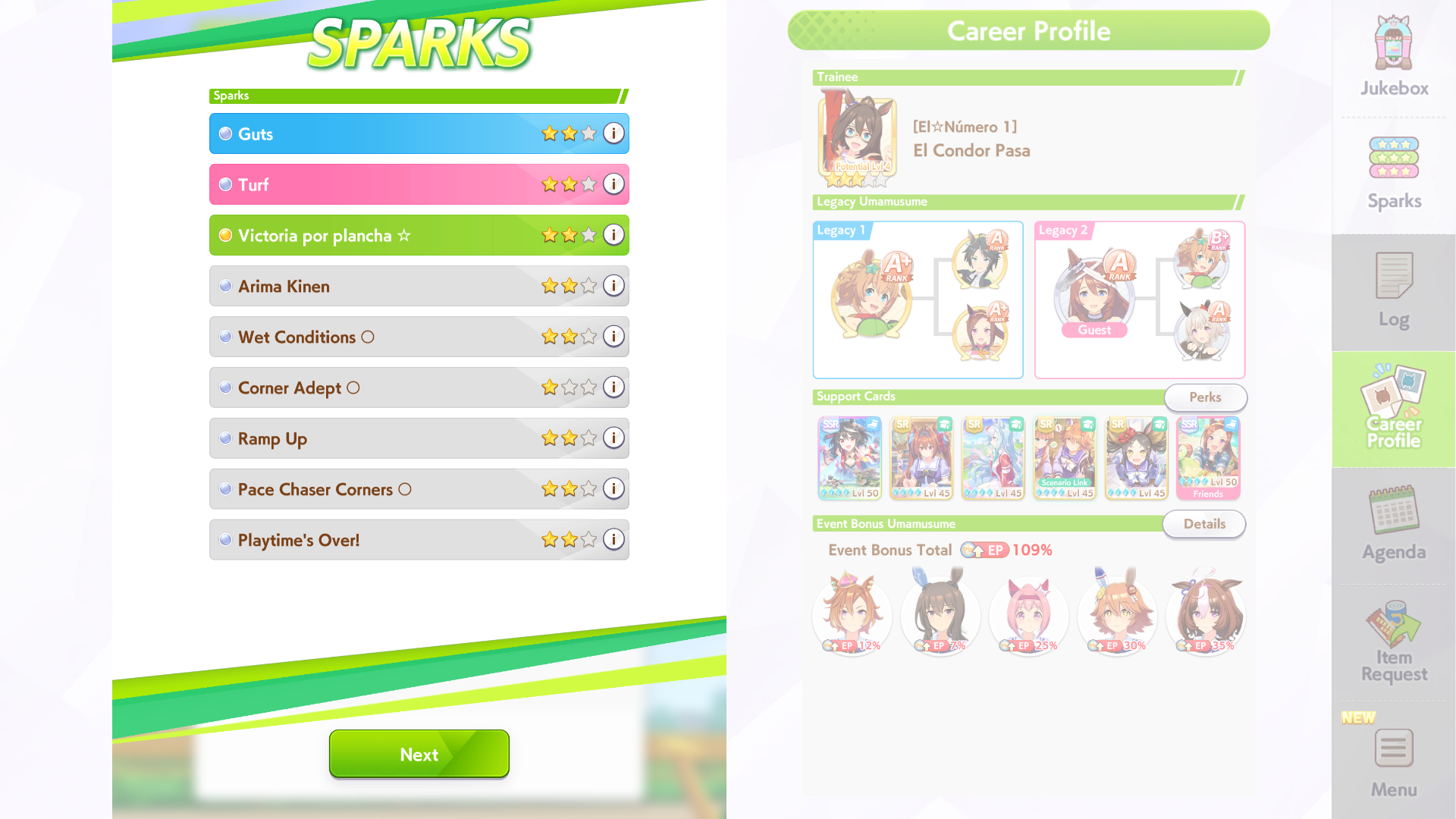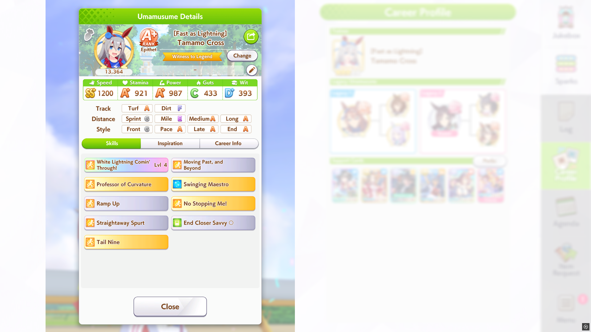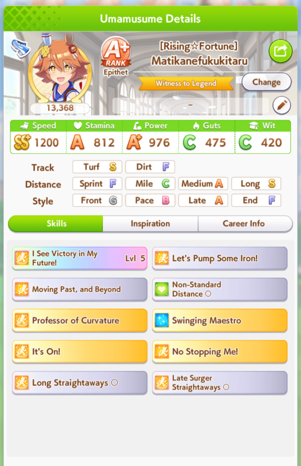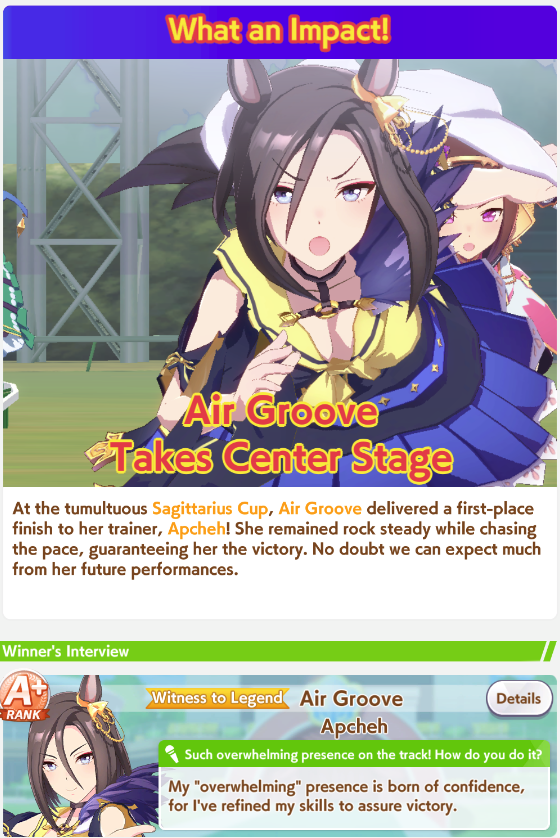 Первое впечатление от карьеры - лёгкая и чилловая. Не знаю как будет дальше, но даже несмотря на противное задание как у Огури а-ля: Выиграй в топ 3 столько то гонок, что принуждает тебя тратить ходы она и Юнити выиграла А ранговой тимой и сама вырывалась вперёд всегда под конец. Ума стан и S не упали и ладно, я и не думал что успею на этот турик её сделать