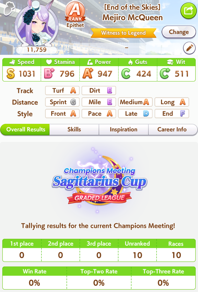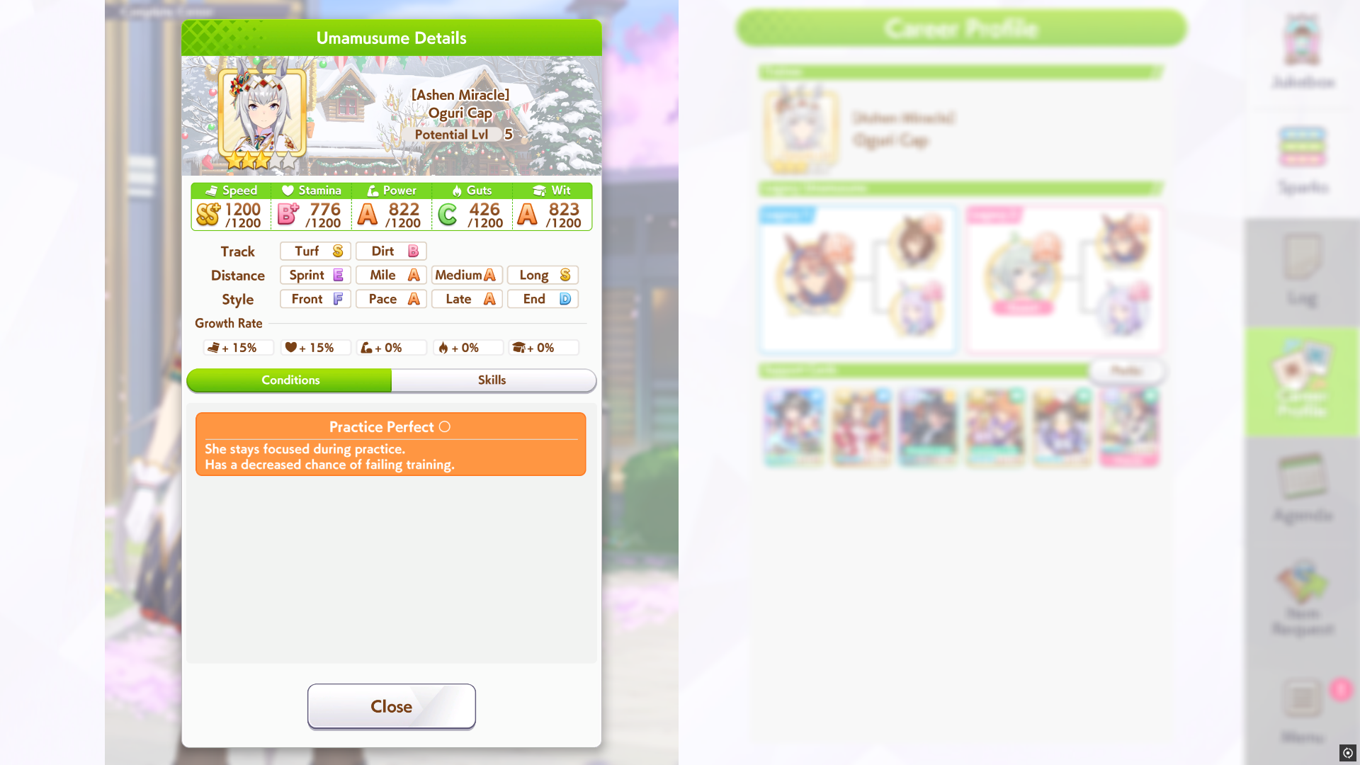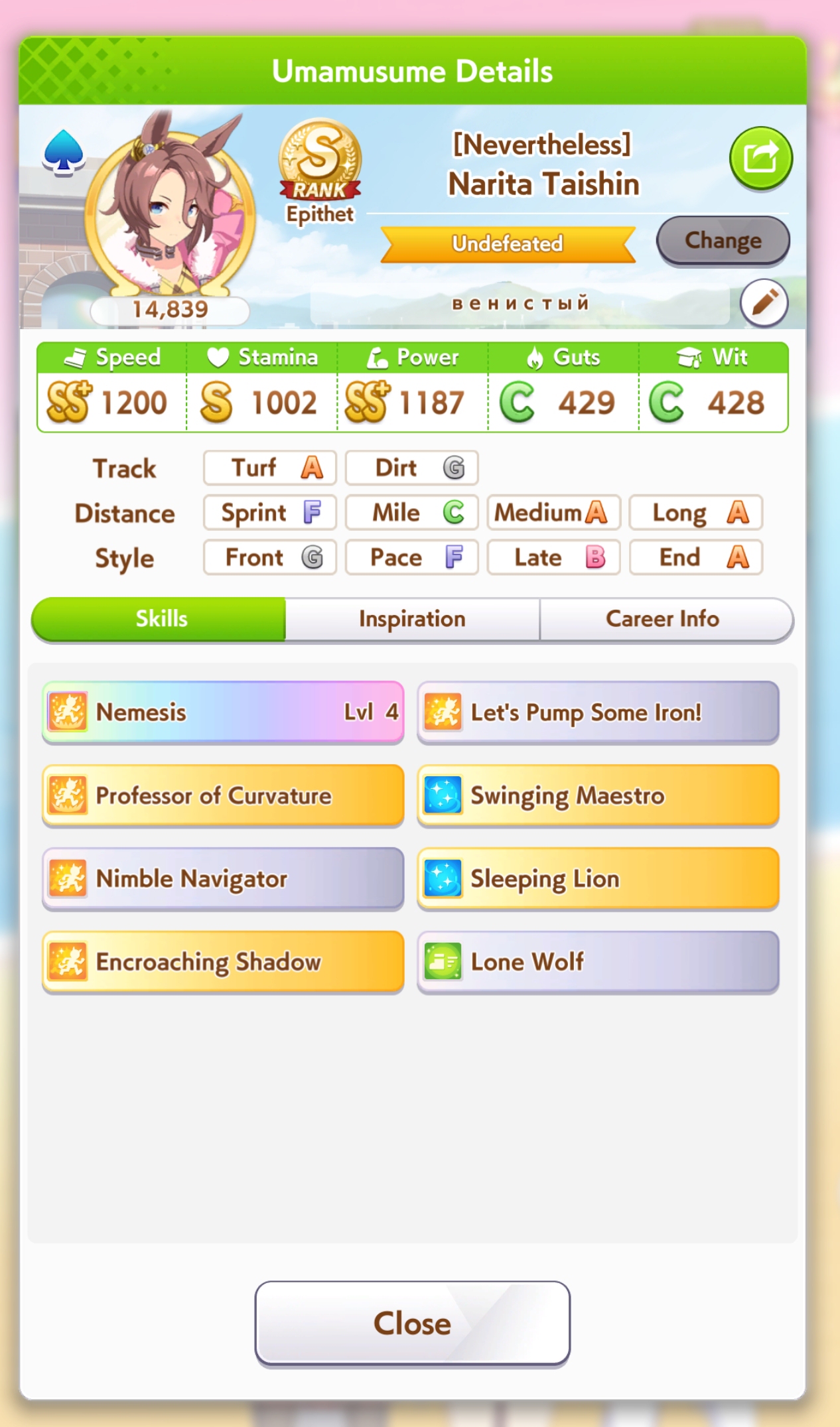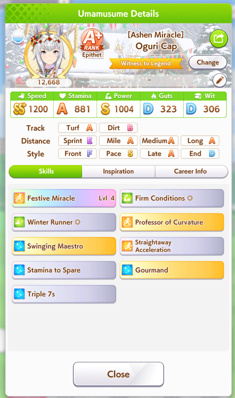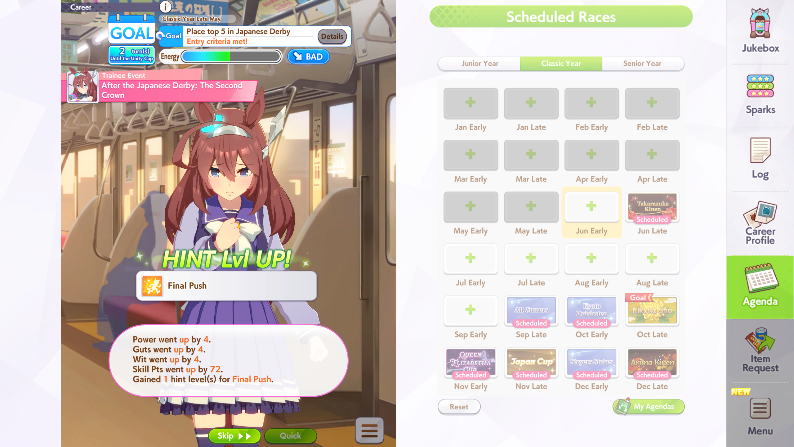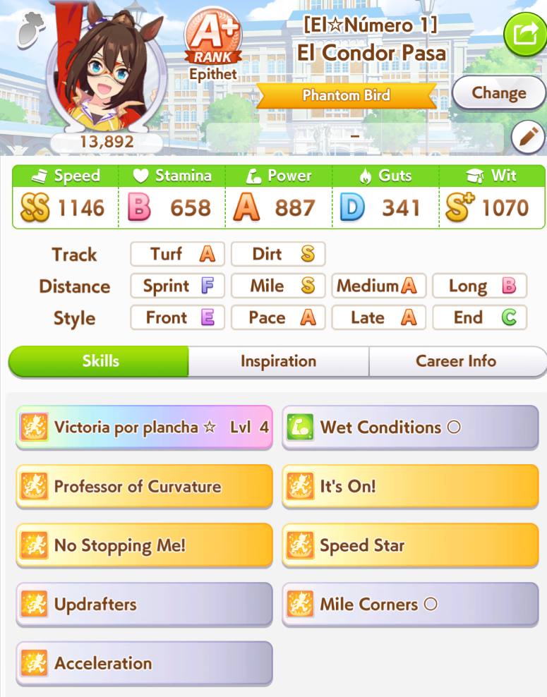 Первое впечатление от карьеры - лёгкая и чилловая. Не знаю как будет дальше, но даже несмотря на противное задание как у Огури а-ля: Выиграй в топ 3 столько то гонок, что принуждает тебя тратить ходы она и Юнити выиграла А ранговой тимой и сама вырывалась вперёд всегда под конец. Ума стан и S не упали и ладно, я и не думал что успею на этот турик её сделать